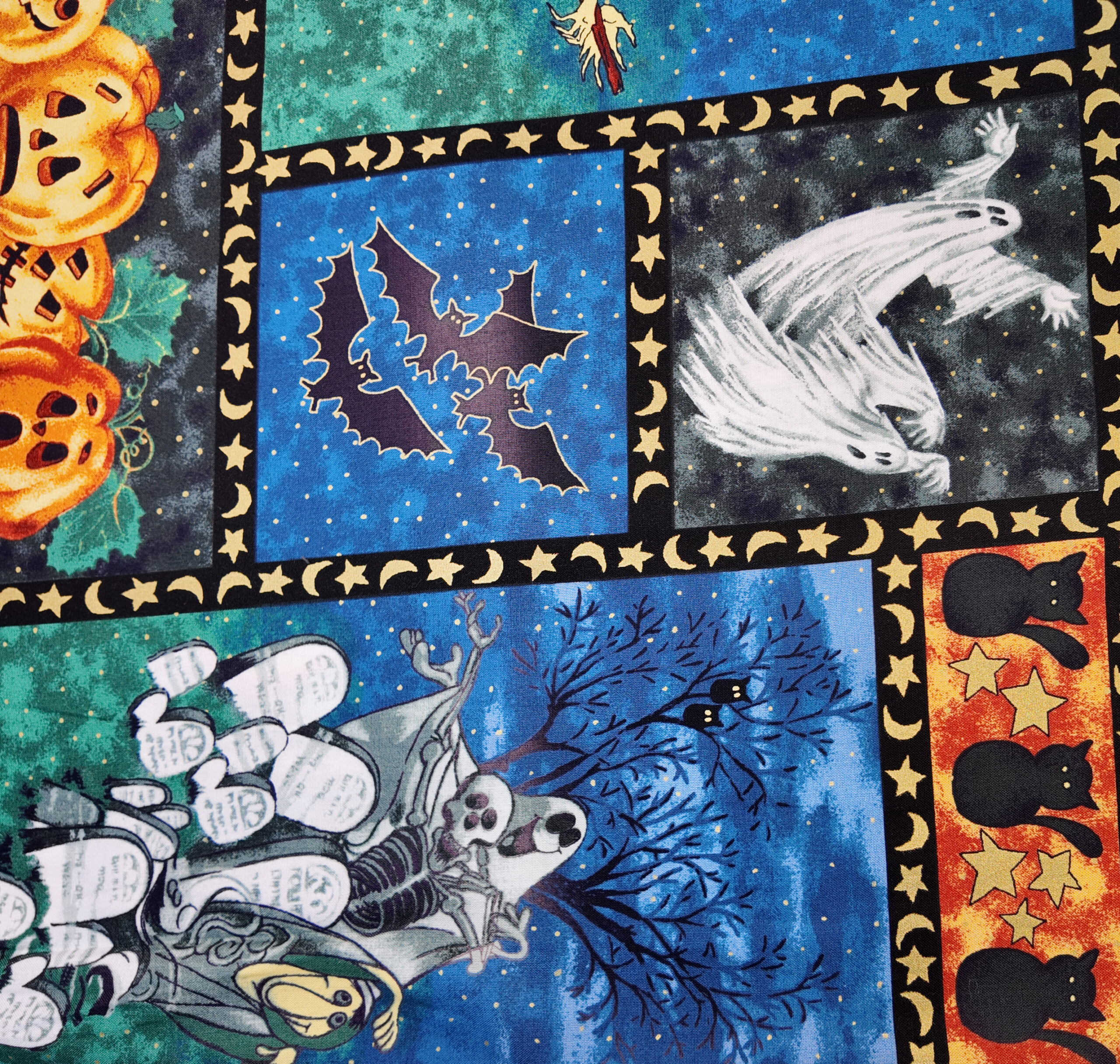 Un patchwork nocturne d’Halloween mêlant fantômes, chauves-souris et citrouilles autour d’un squelette rêveur sous les étoiles.