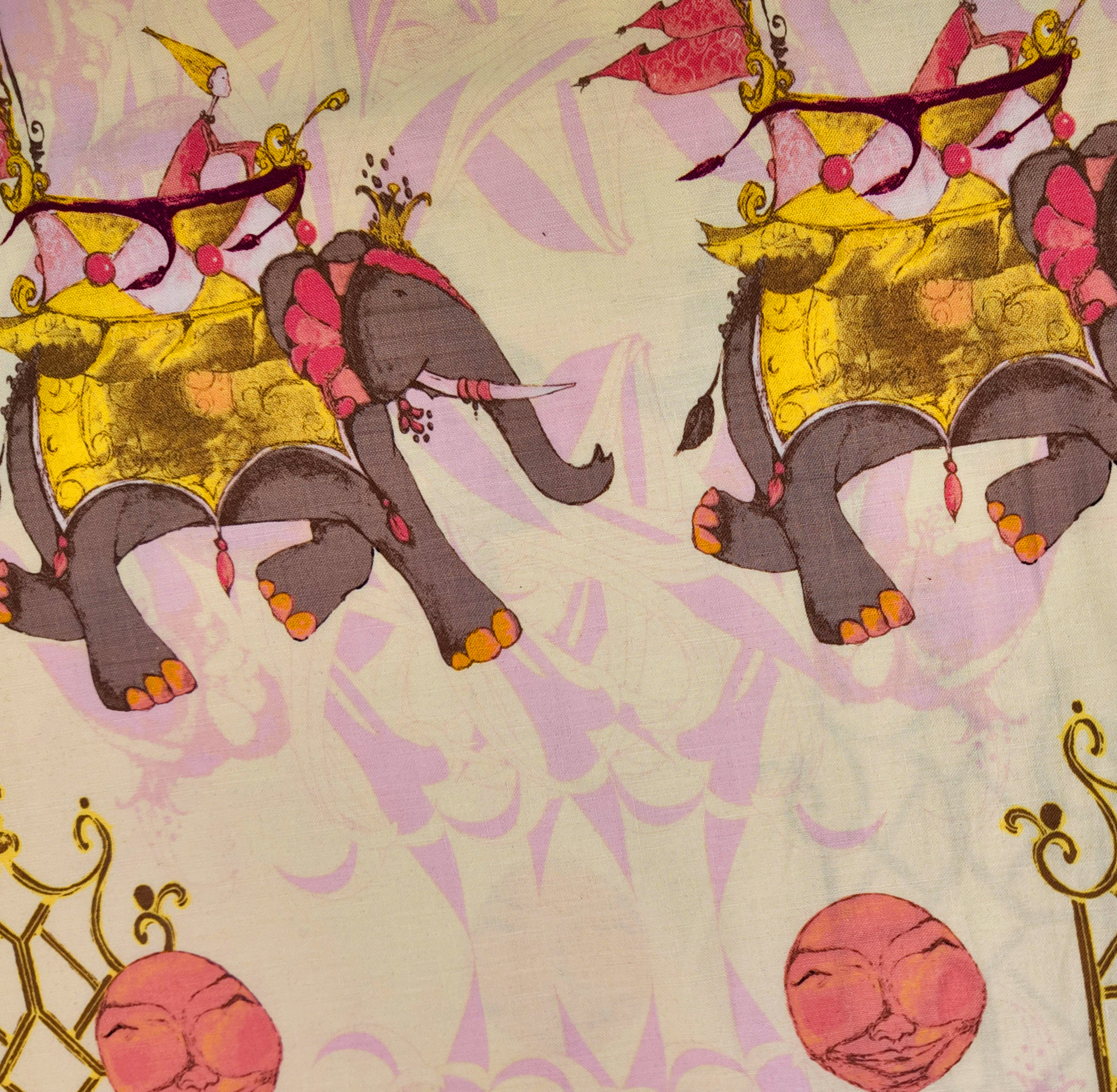 Deux éléphants stylisés avancent en cortège sous un voile rosé, parés d’or et de mauve dans une ambiance de parade orientale.
