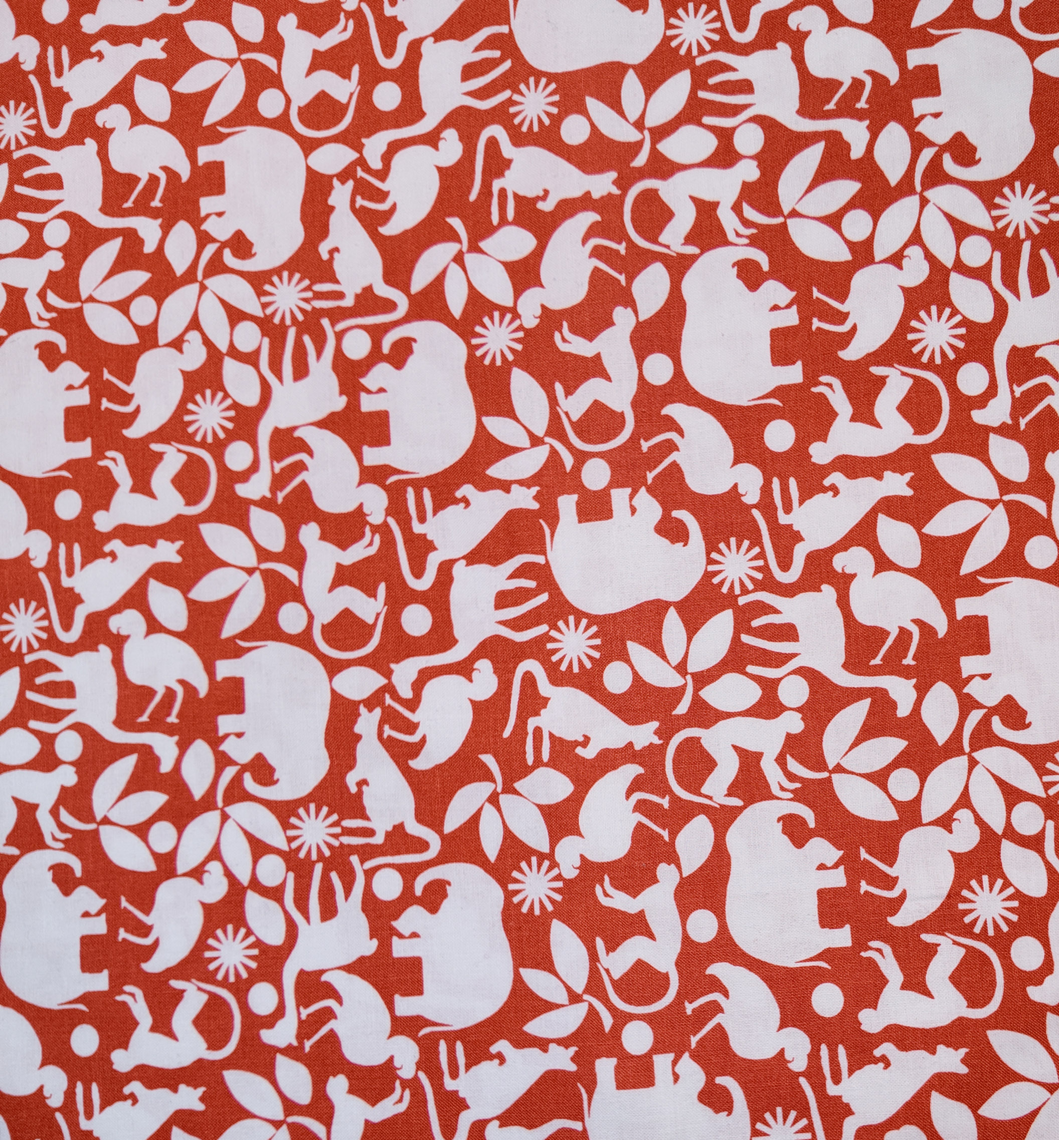 Silhouettes blanches d’animaux et de feuillages se détachent sur fond rouille, dans un jeu graphique évoquant la savane.