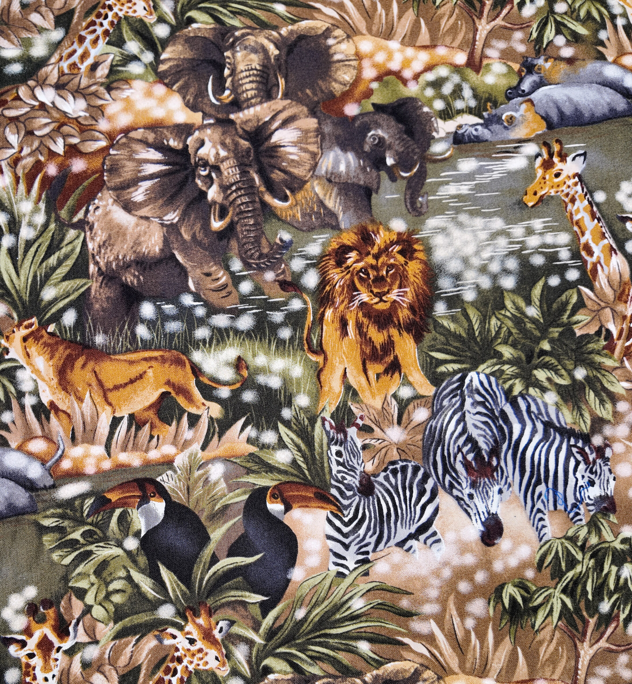Une scène luxuriante de jungle tropicale peuplée d’éléphants, lions, zèbres et toucans. Les tons bruns et verts s’entrelacent, offrant une explosion de vie et de mouvement dans la forêt humide.