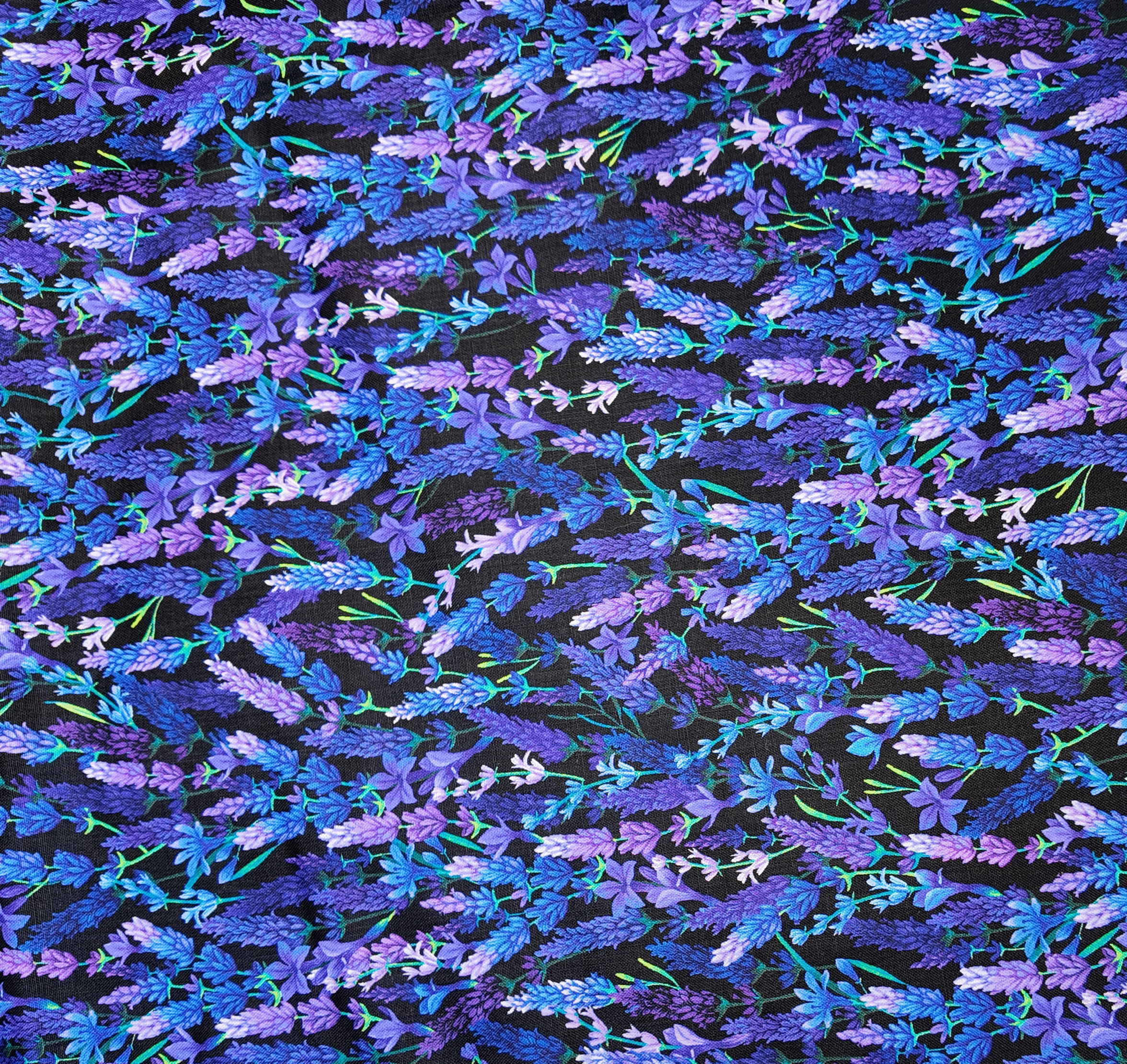 Une pluie de petites fleurs bleues et mauves se déploie sur un fond sombre, évoquant un champ de lavande au crépuscule. L’ensemble forme un mouvement léger et parfumé.