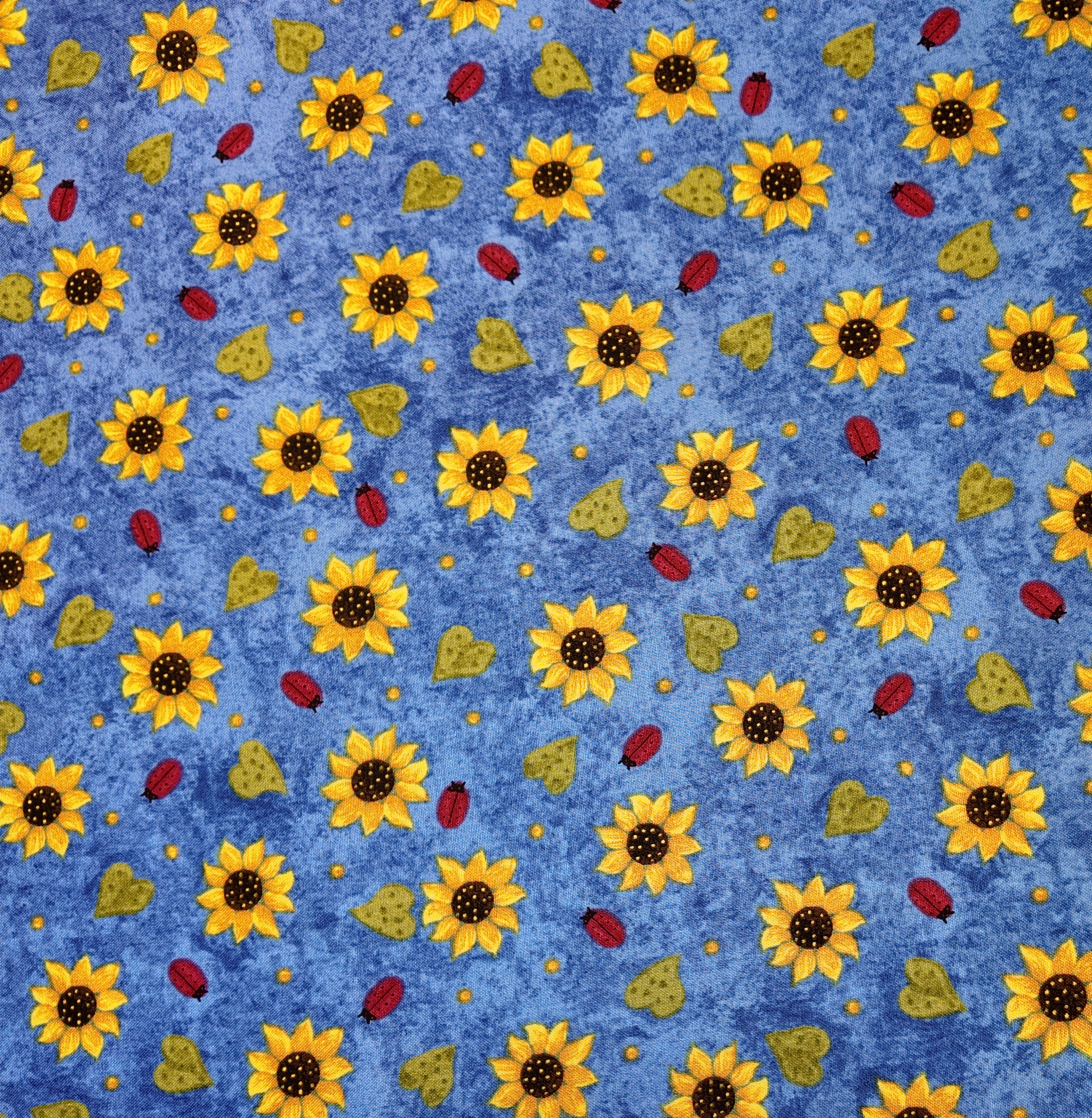 De petits tournesols éclatants dansent sur un fond bleu d’été, accompagnés de coccinelles et de feuillages tendres. Ce tissu rayonne de gaieté et d’insouciance, comme un jardin joyeux sous le soleil.