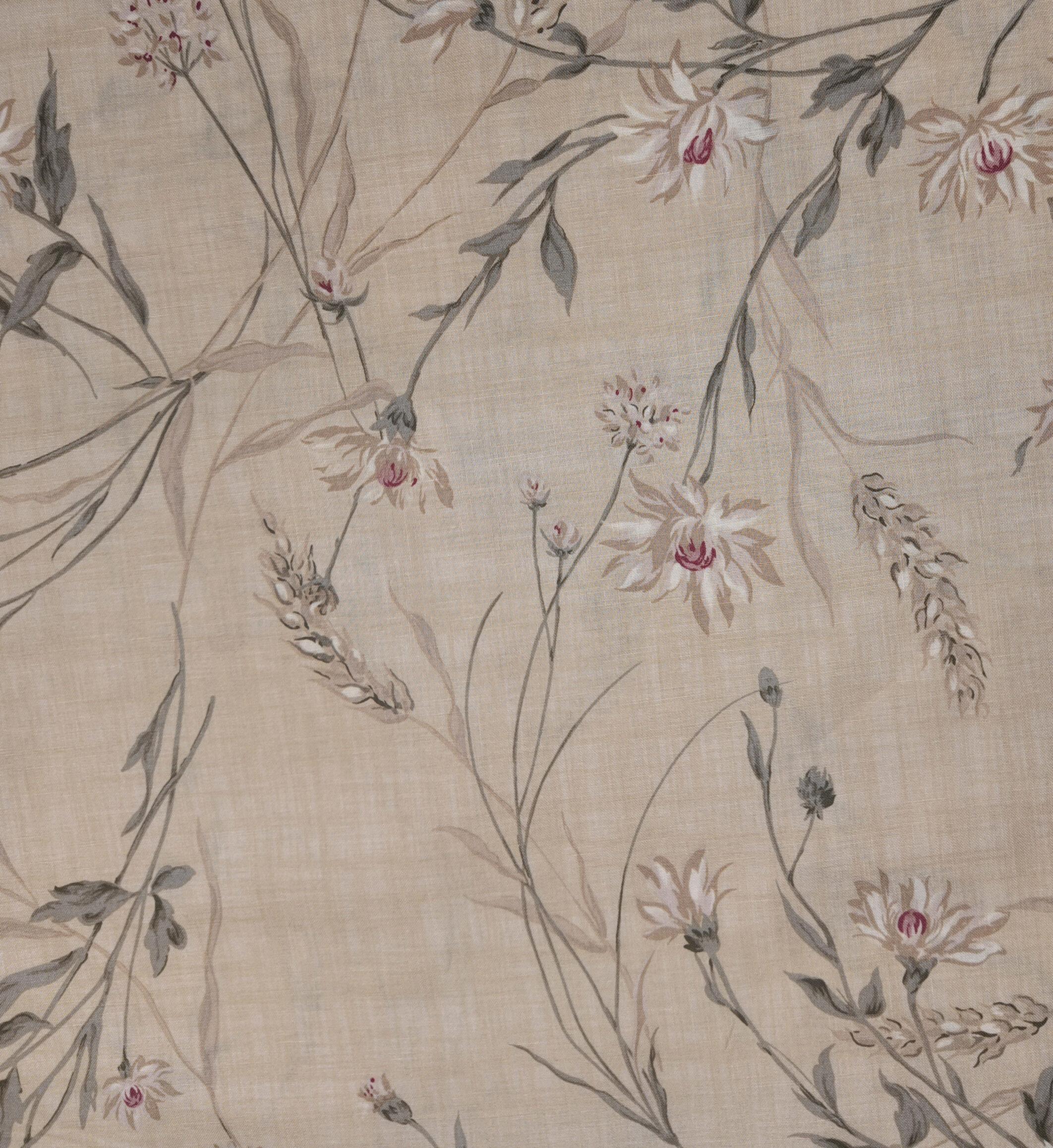 Des bouquets poudrés s’épanouissent sur une toile beige, comme des souvenirs d’un jardin d’automne. Les roses fanées, les feuillages grisés et les tiges effilées composent une mélodie douce et feutrée. Ce tissu murmure l’élégance d’un temps suspendu, entre nostalgie et tendresse.