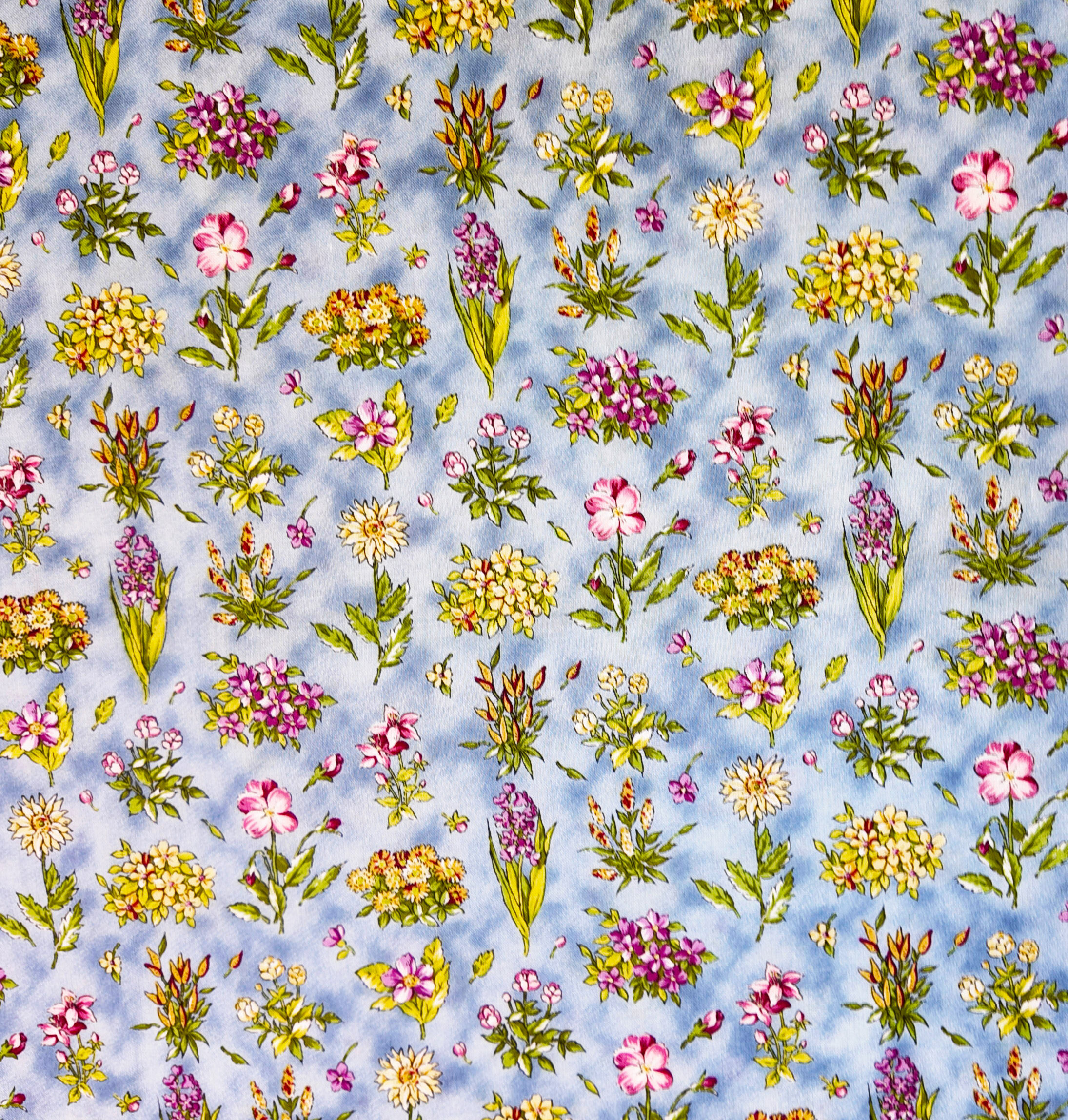 Un ciel d’aquarelle bleue sert de toile à de petits bouquets champêtres, peints de mauve, rose et vert tendre. Le motif respire la campagne, doux et enjoué, comme un herbier léger sur fond vaporeux. Motif petit et espacé.