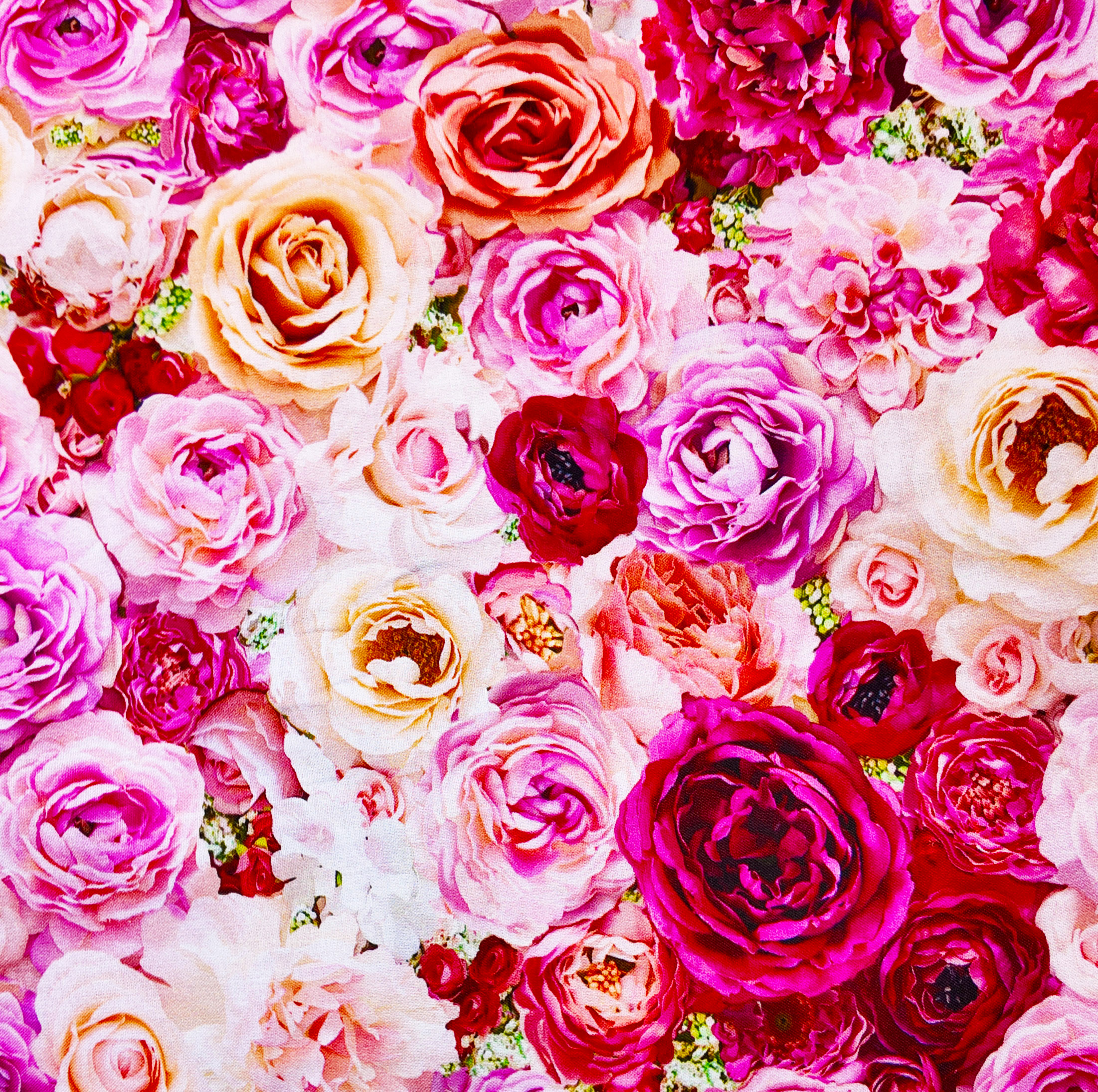Une profusion de roses et pivoines aux tons rose, rouge et pêche se mêle dans une composition voluptueuse. Le tissu évoque un jardin plein de parfums et de lumière, entre éclat et tendresse. Motif large et foisonnant.