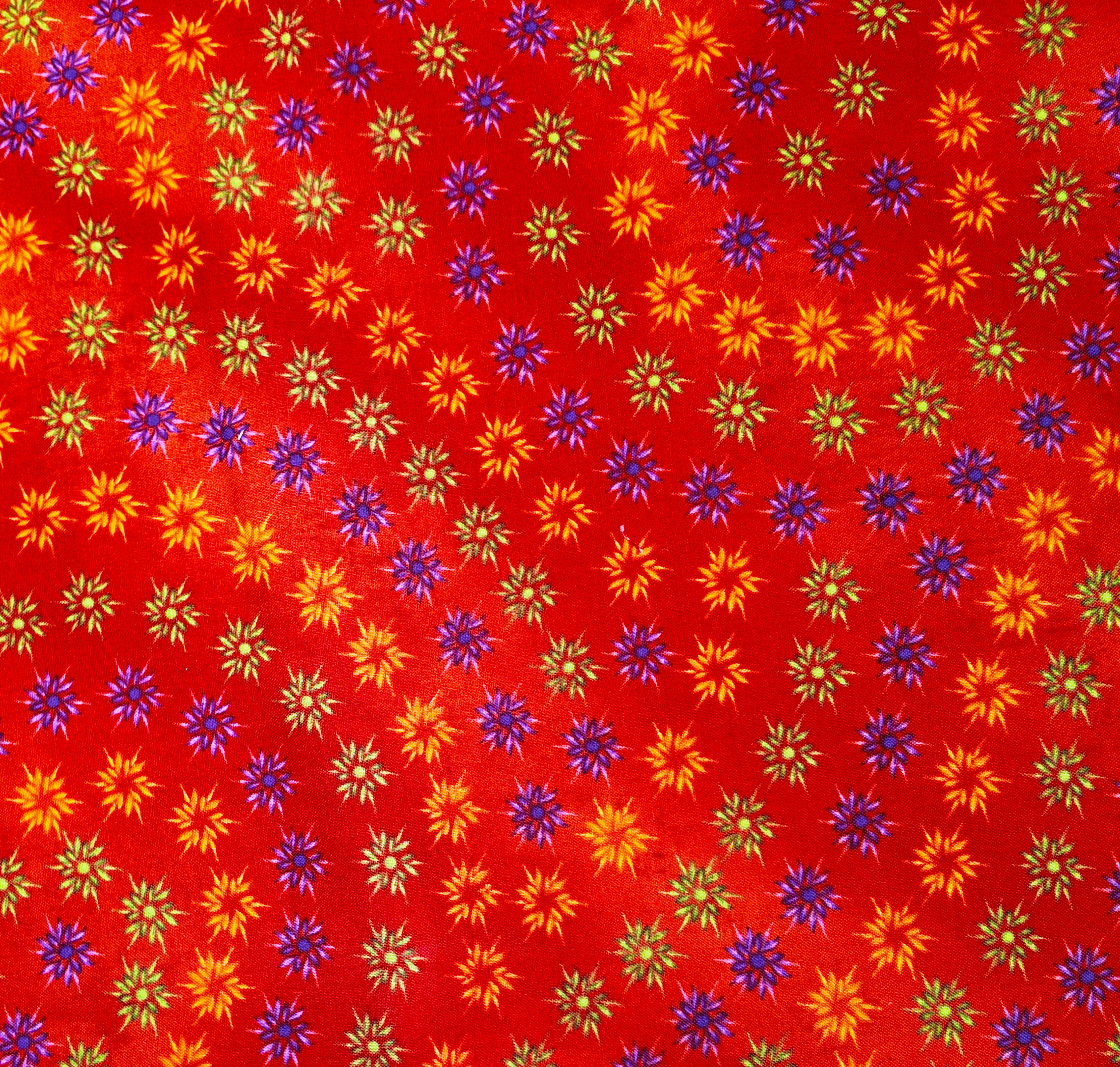 Un fond rouge vif constellé de petites étoiles florales en dégradés de bleu, vert et or. Le tissu évoque un ciel festif ou un feu d’artifice stylisé, équilibré et rayonnant. Motif petit et répétitif.