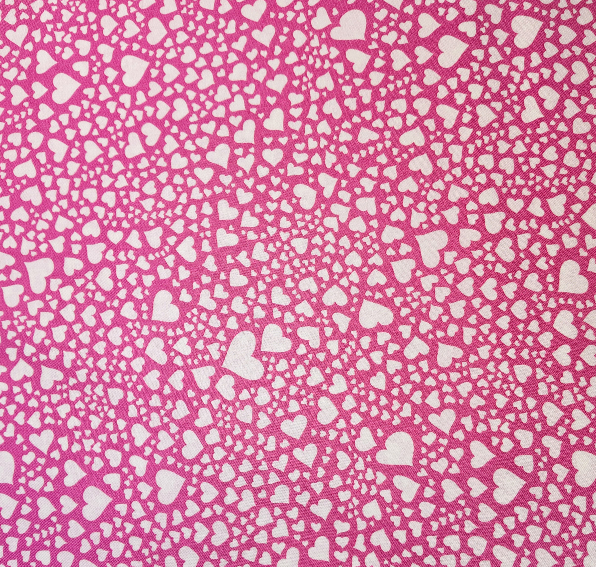 Sur un fond rose vif, une pluie de cœurs blancs de tailles variées s’enlace en un rythme joyeux et tendre. Le tissu évoque la fantaisie légère et la douceur des émotions. Motif petit et régulier.