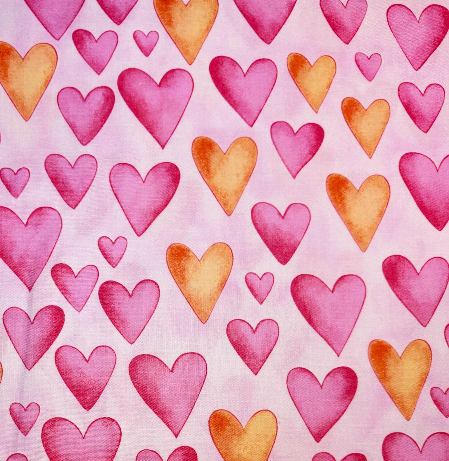 De grands cœurs rose et orangé flottent sur un fond dégradé de rose tendre. L’effet est à la fois doux et éclatant, comme un nuage d’émotions. Motif moyen et régulier.