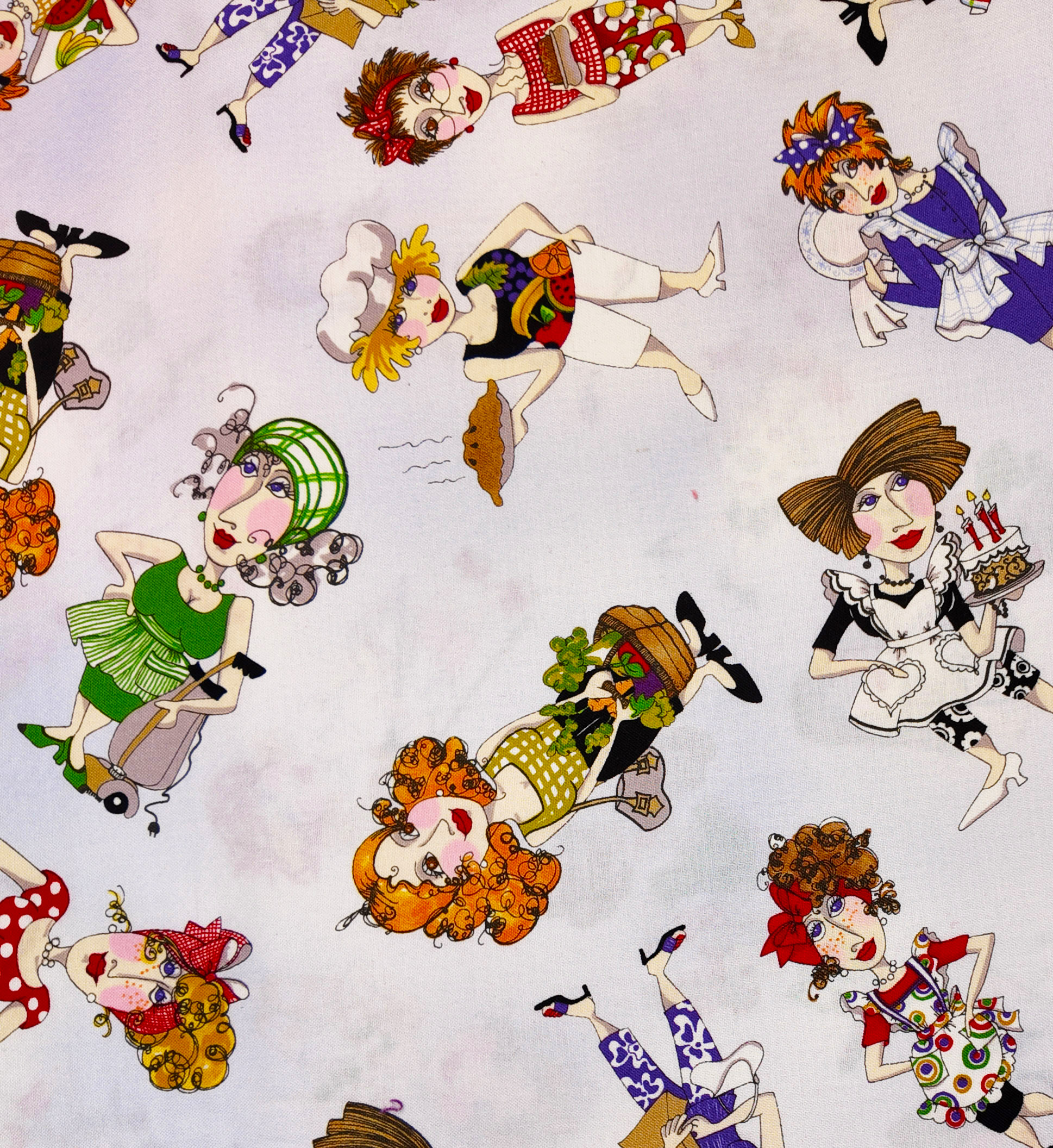 Des personnages féminins caricaturaux se promènent sur fond clair, chacune exprimant une fantaisie vive et pleine d’humour. Le dessin joue avec les postures et les couleurs pour un effet théâtral. Motif moyen et figuratif.