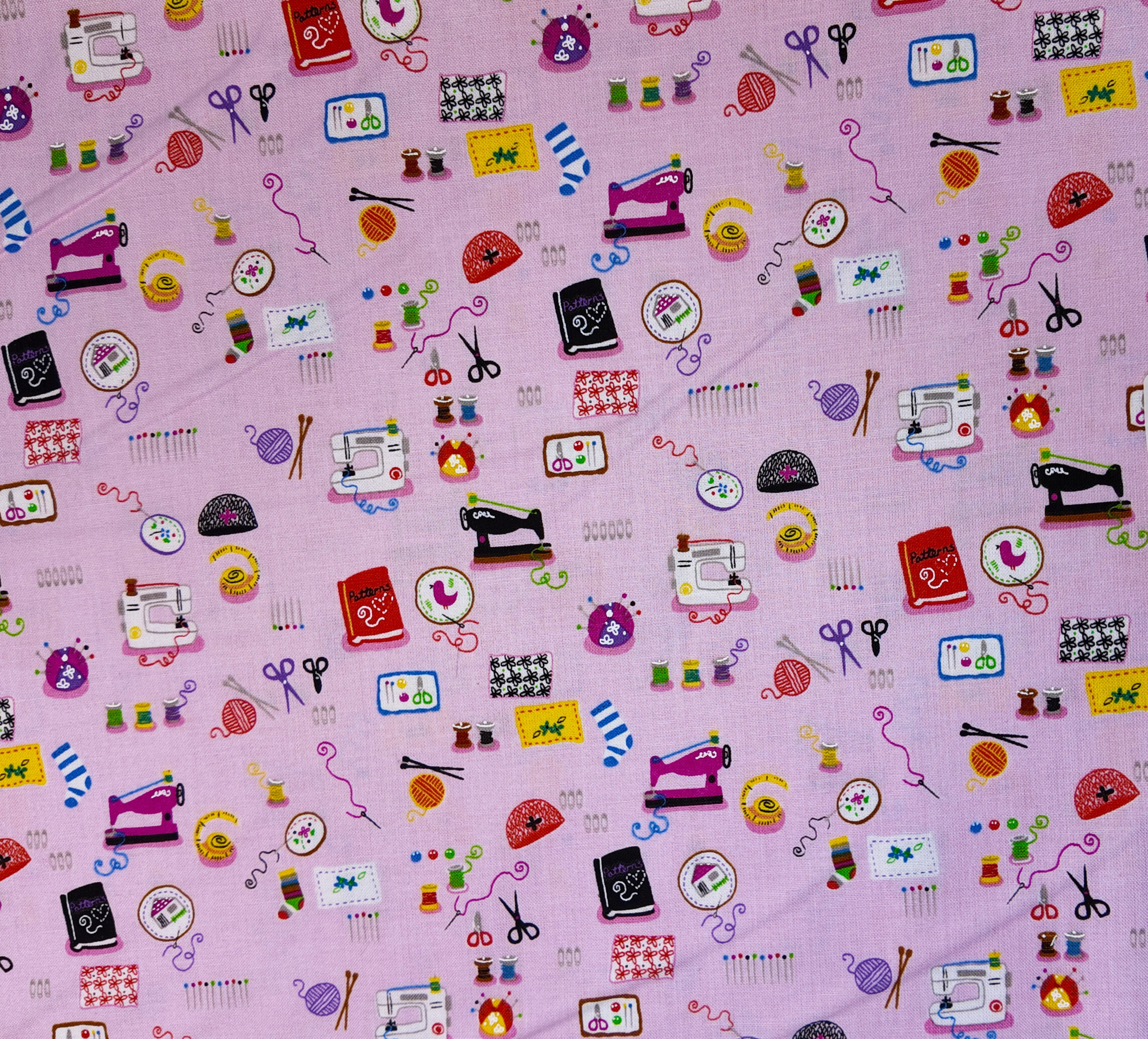 Sur un fond rose tendre, machines à coudre, bobines, aiguilles et pelotes composent un univers graphique et coloré dédié à la couture. L’ensemble respire la gaieté artisanale. Motif petit et répétitif.