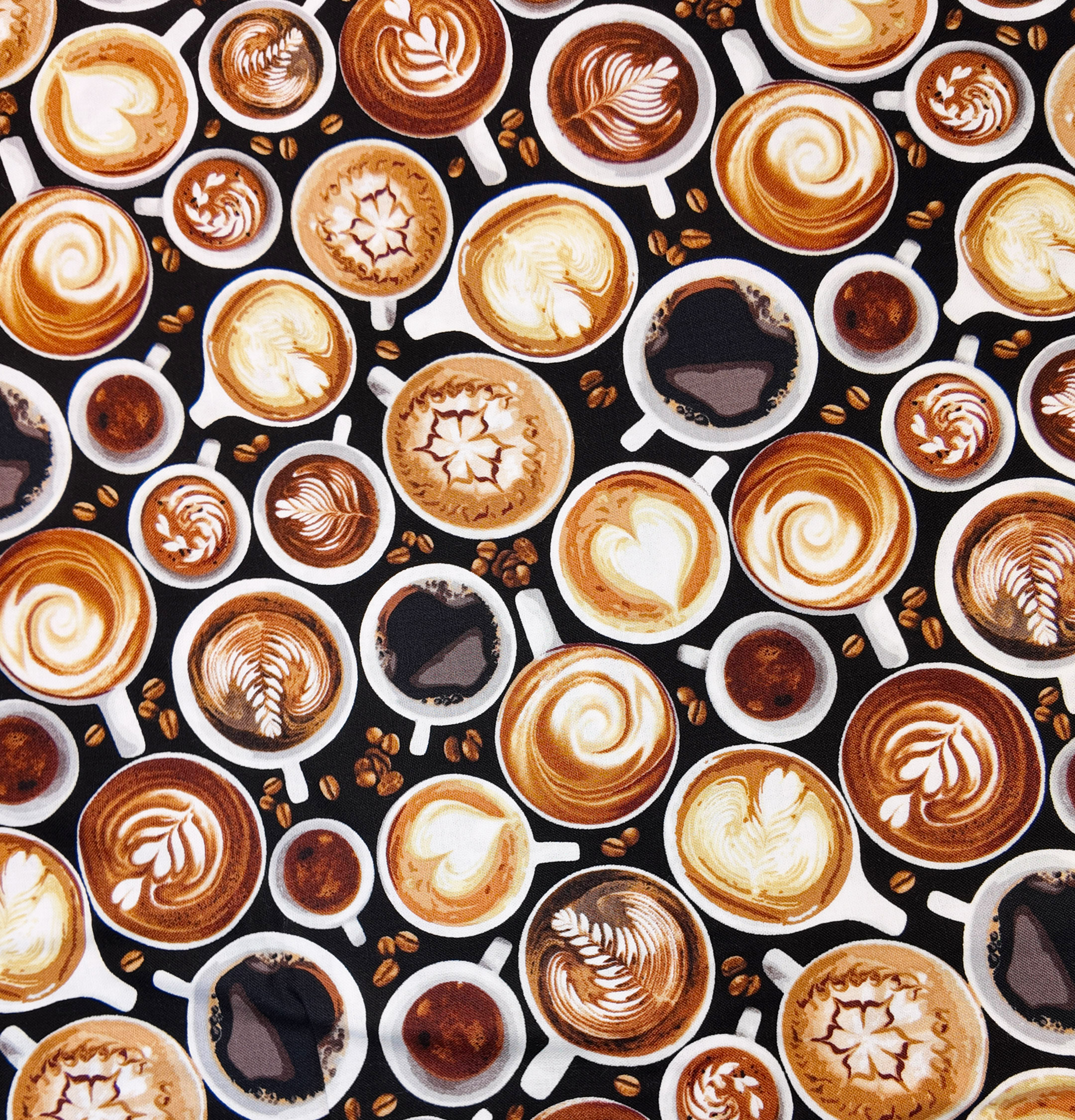Une farandole de cafés crémeux se déploie sur fond noir, mêlant cappuccinos, expressos et lattes ornés de mousse dessinée. L’ensemble dégage une chaleur gourmande et un charme de bistrot. Motif moyen et répétitif.