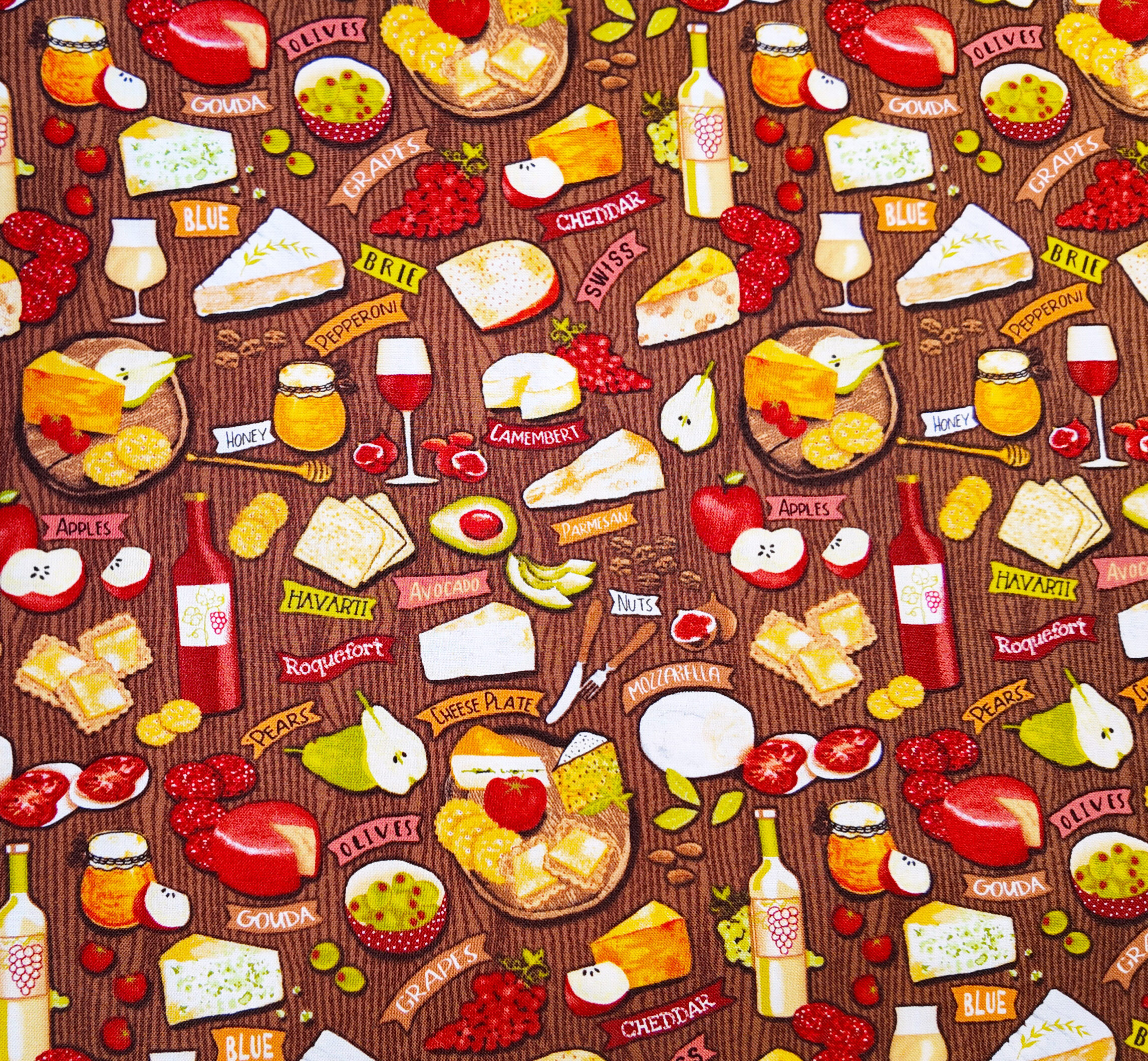 Une table gourmande se dessine sur fond brun, couverte de fromages, fruits, vins et étiquettes colorées. L’ensemble évoque la convivialité d’une soirée épicurienne. Motif moyen et détaillé.