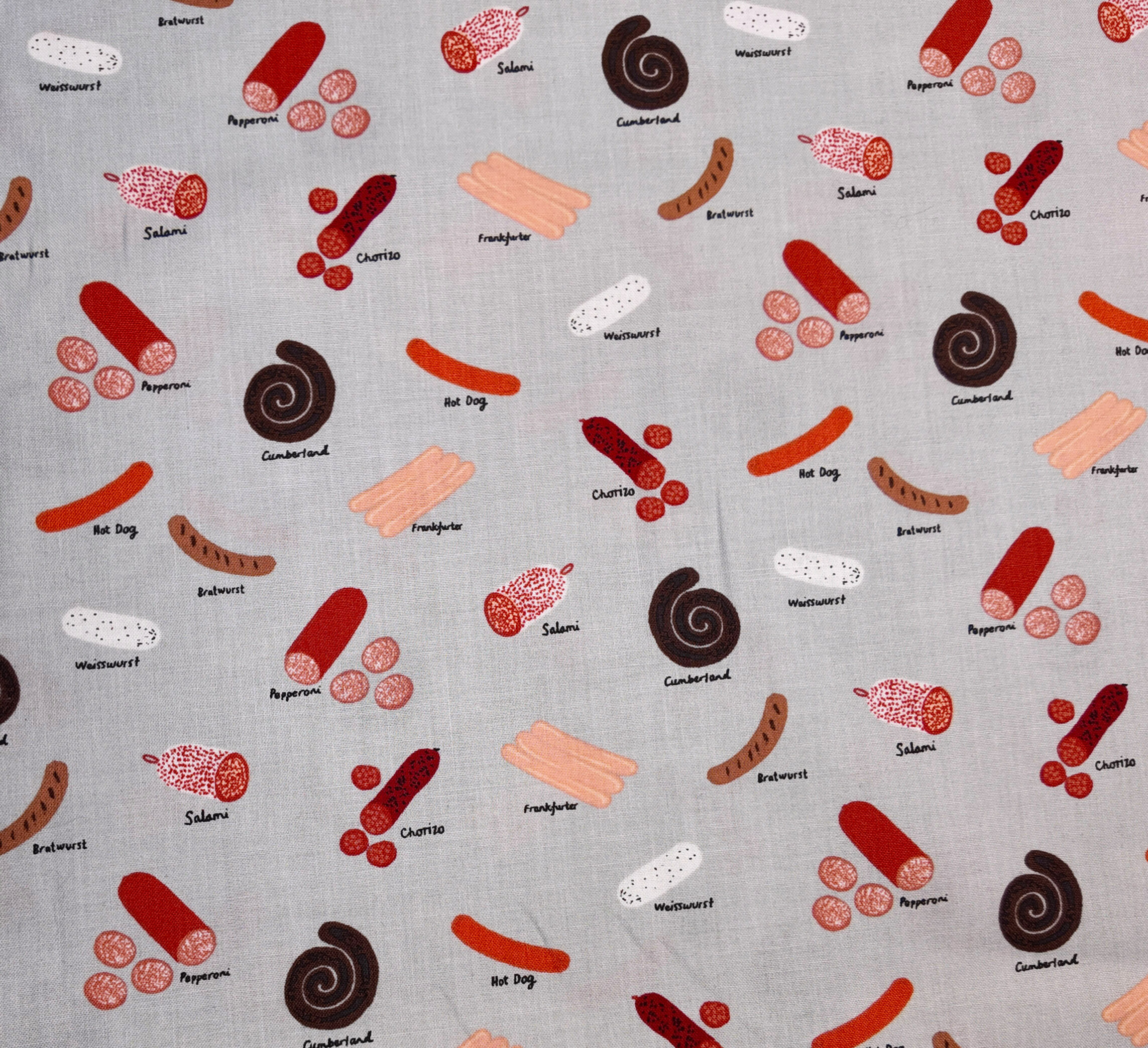 Sur fond gris clair, une collection de charcuteries dessinées avec humour — saucisses, salamis et chorizos — se déploie en un motif ludique et gourmand. Motif moyen et espacé.