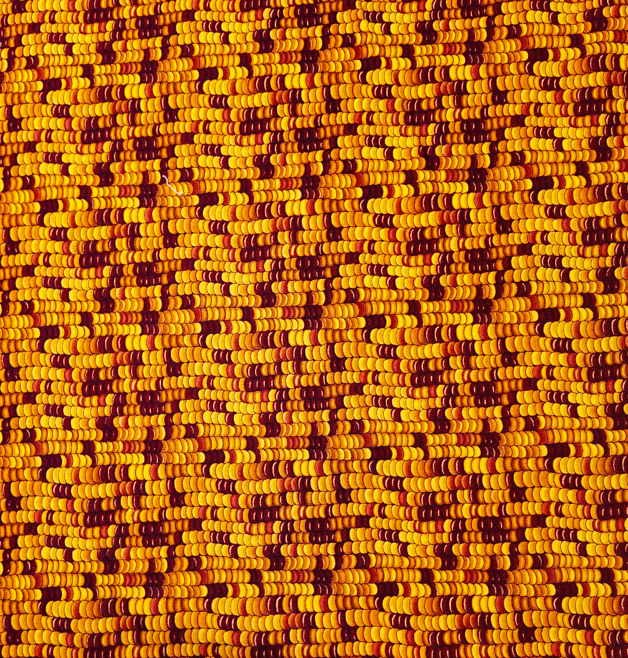 Des rangées de grains de maïs jaune et bordeaux se succèdent en un rythme chaleureux. Le tissu respire la campagne et la générosité de la récolte. Motif moyen et texturé.