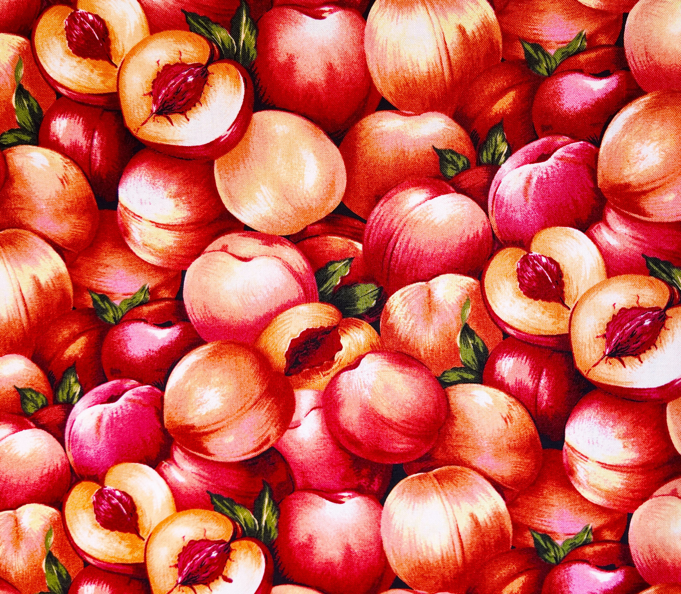 Des pêches gorgées de soleil s’étreignent sur l’étoffe, mêlant leurs teintes rosées et orangées dans un éclat de fruit mûr. On y sent la douceur juteuse de l’été et la promesse d’une lumière sucrée.