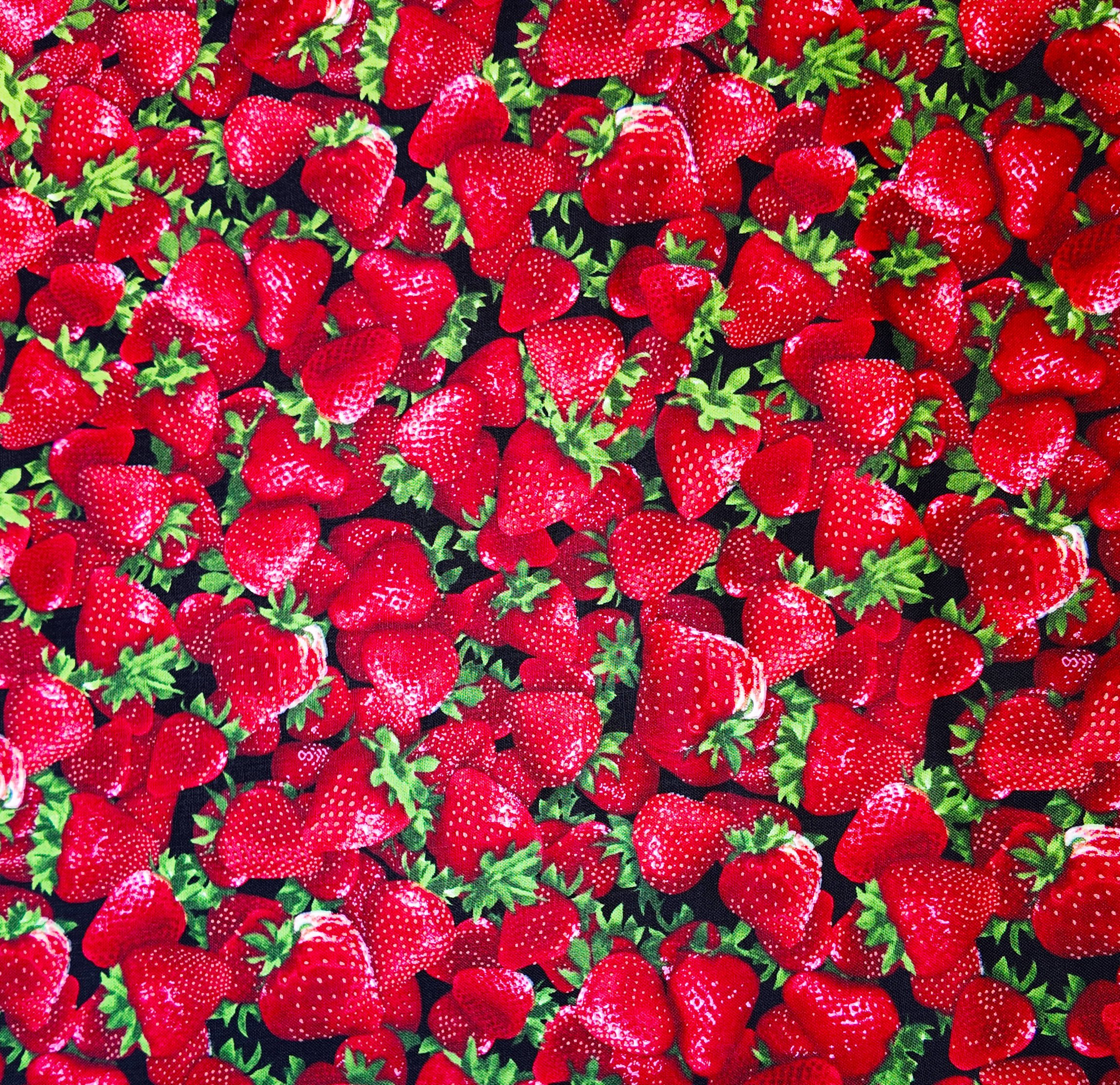 Des fraises éclatantes tapissent le tissu, rouges et pulpeuses, parées de leur feuillage vert vif. Cette étoffe respire la fraîcheur, la gourmandise et la douceur d’un été fruité.