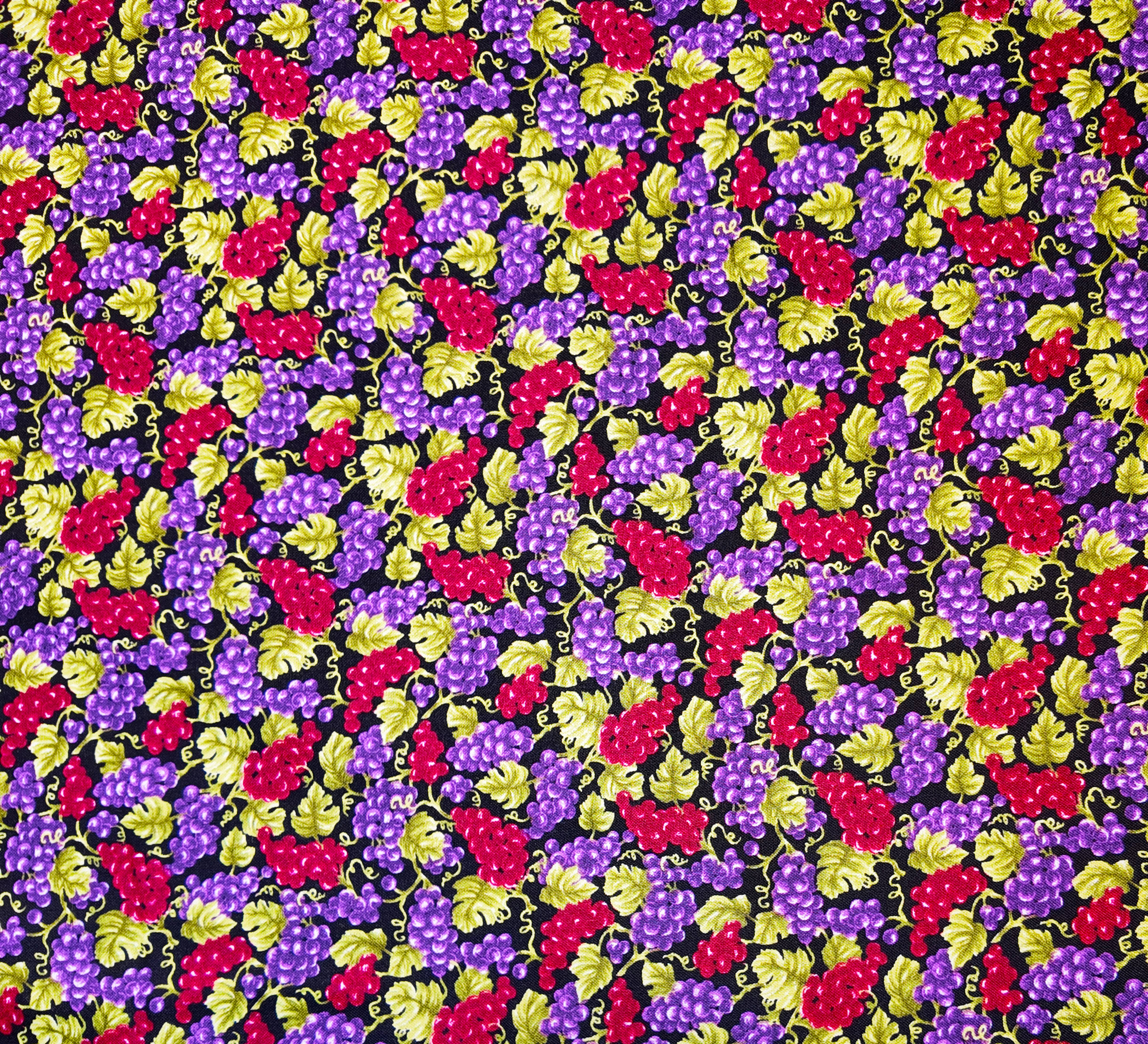Des grappes de raisin rouge et violet s’épanouissent parmi des feuilles dorées. Ce tissu évoque la richesse des vendanges et la chaleur des fins d’été baignées de lumière.