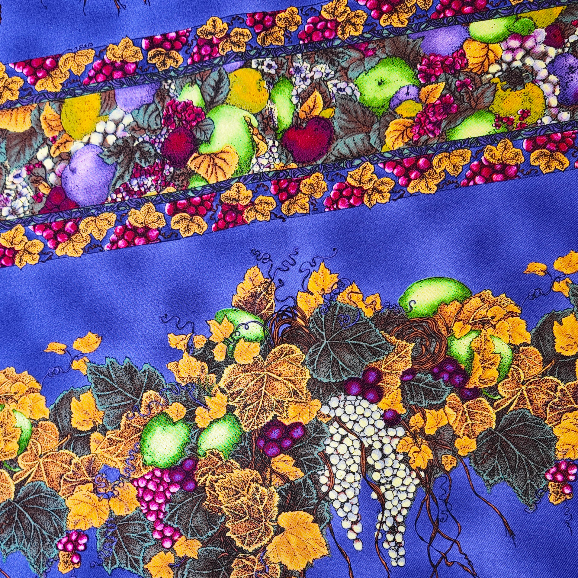Un festival de fruits et de feuilles dorées s’épanouit sur un bleu profond. Pommes, raisins et feuillages d’automne se mêlent dans une symphonie généreuse rappelant les vendanges et les récoltes abondantes.