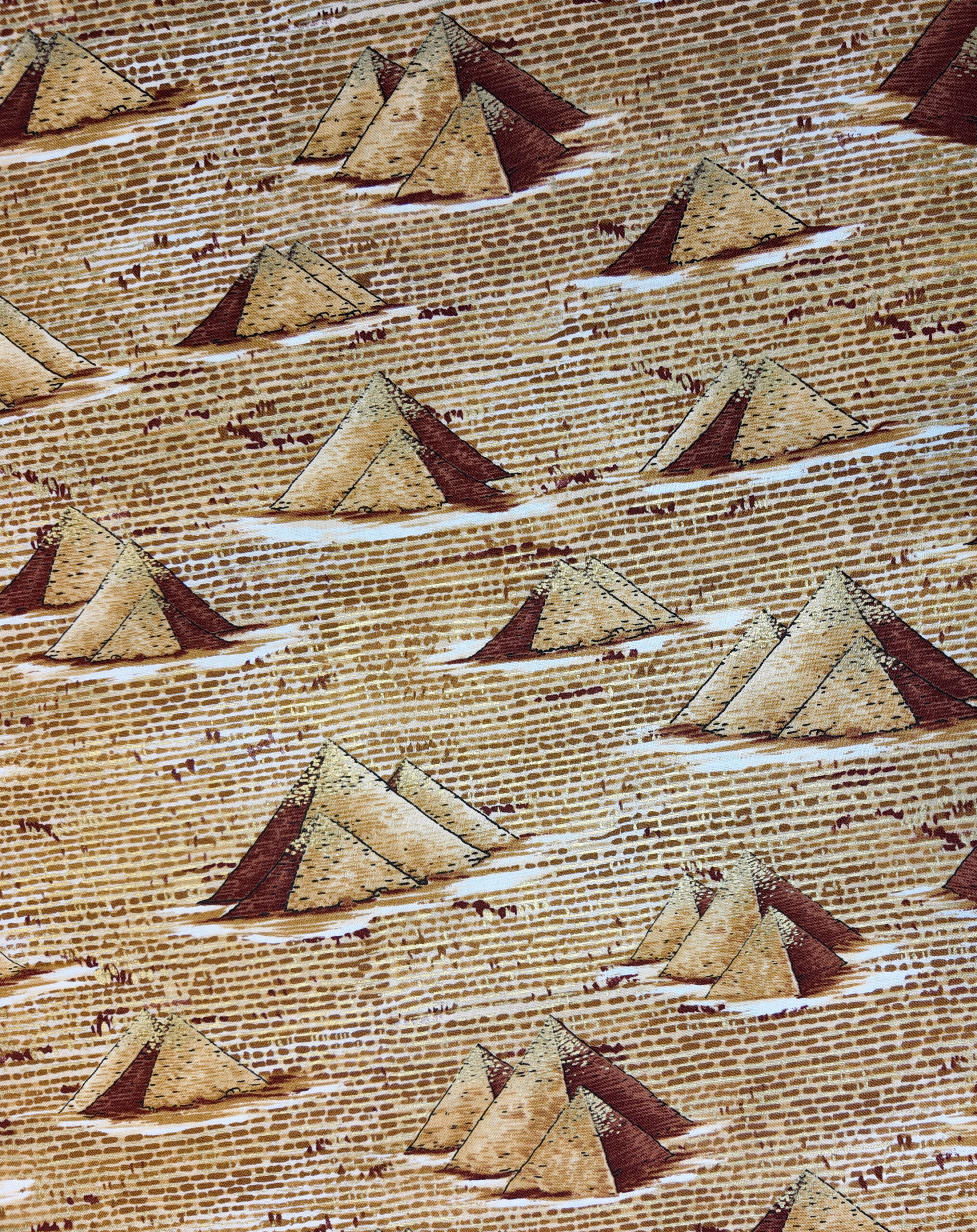 Des pyramides dorées se dressent sur un sable texturé de lignes ocre et brunes. Le tissu respire la majesté du désert et la mémoire des civilisations anciennes.