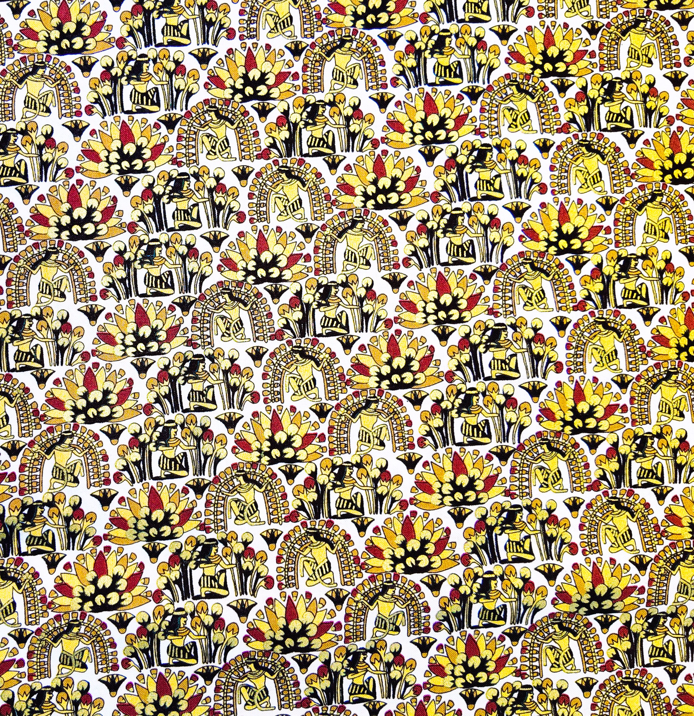 Des motifs inspirés de fresques antiques s’épanouissent en arcs floraux jaune, rouge et noir. Le tissu célèbre l’art ancien dans une danse rythmée et lumineuse.