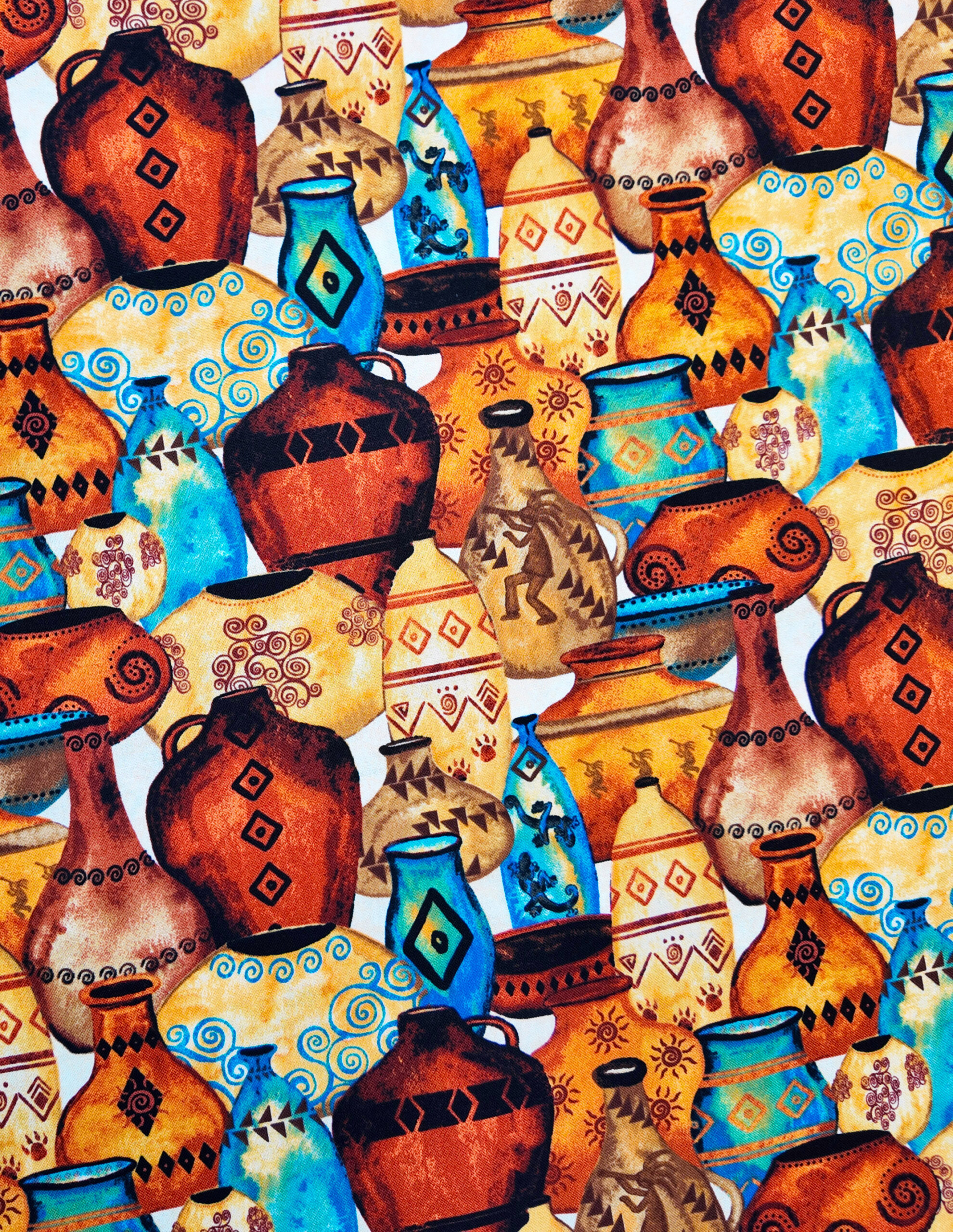 Une collection d’amphores et de jarres en terre cuite se dresse dans un jeu de tons fauves et turquoise. Le tissu évoque la chaleur du désert et l’art millénaire des potiers du Sud.