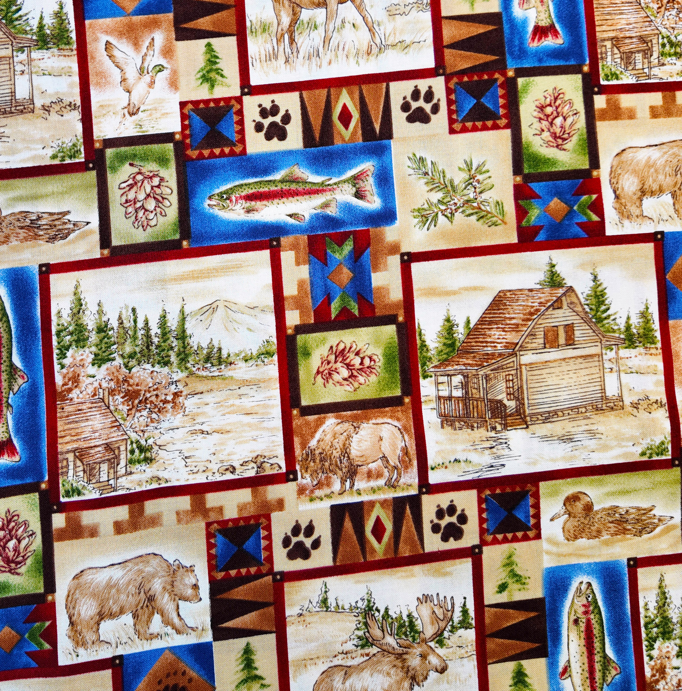 Des scènes de cabanes, d’animaux et de forêts se juxtaposent dans un patchwork de couleurs chaudes et bleutées. Le tissu évoque les paysages nord-américains, entre bois, rivières et faune paisible.