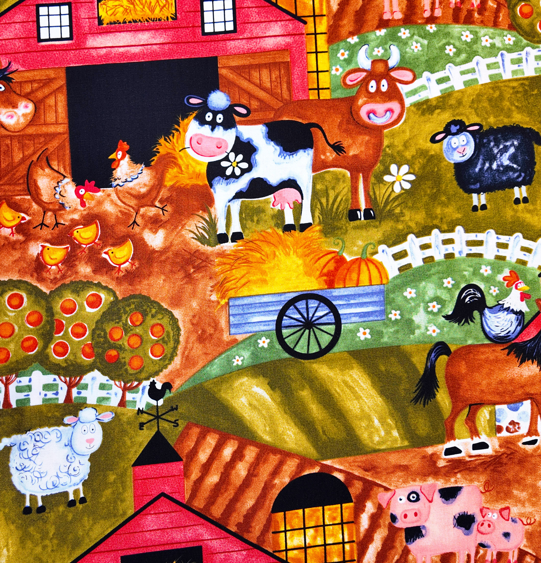 Une ferme colorée grouille d’animaux joyeux : vaches, poules, moutons et cochons. Le tissu, plein de gaieté, évoque les comptines enfantines et la chaleur des étables.