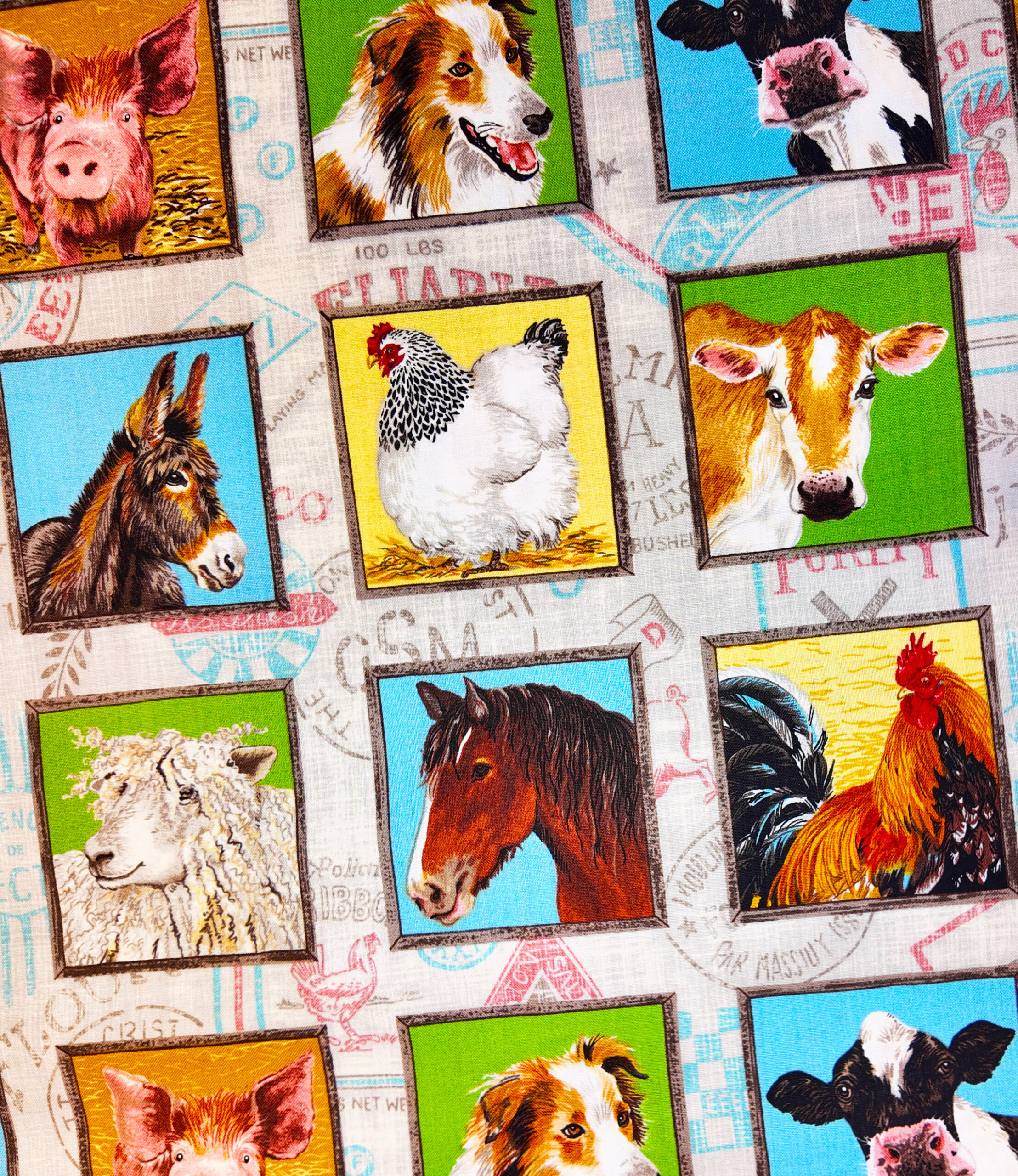 Des portraits d’animaux de ferme s’encadrent dans des carrés colorés : cheval, vache, mouton, chien et coq. Le tissu célèbre la diversité et la vitalité du monde rural.