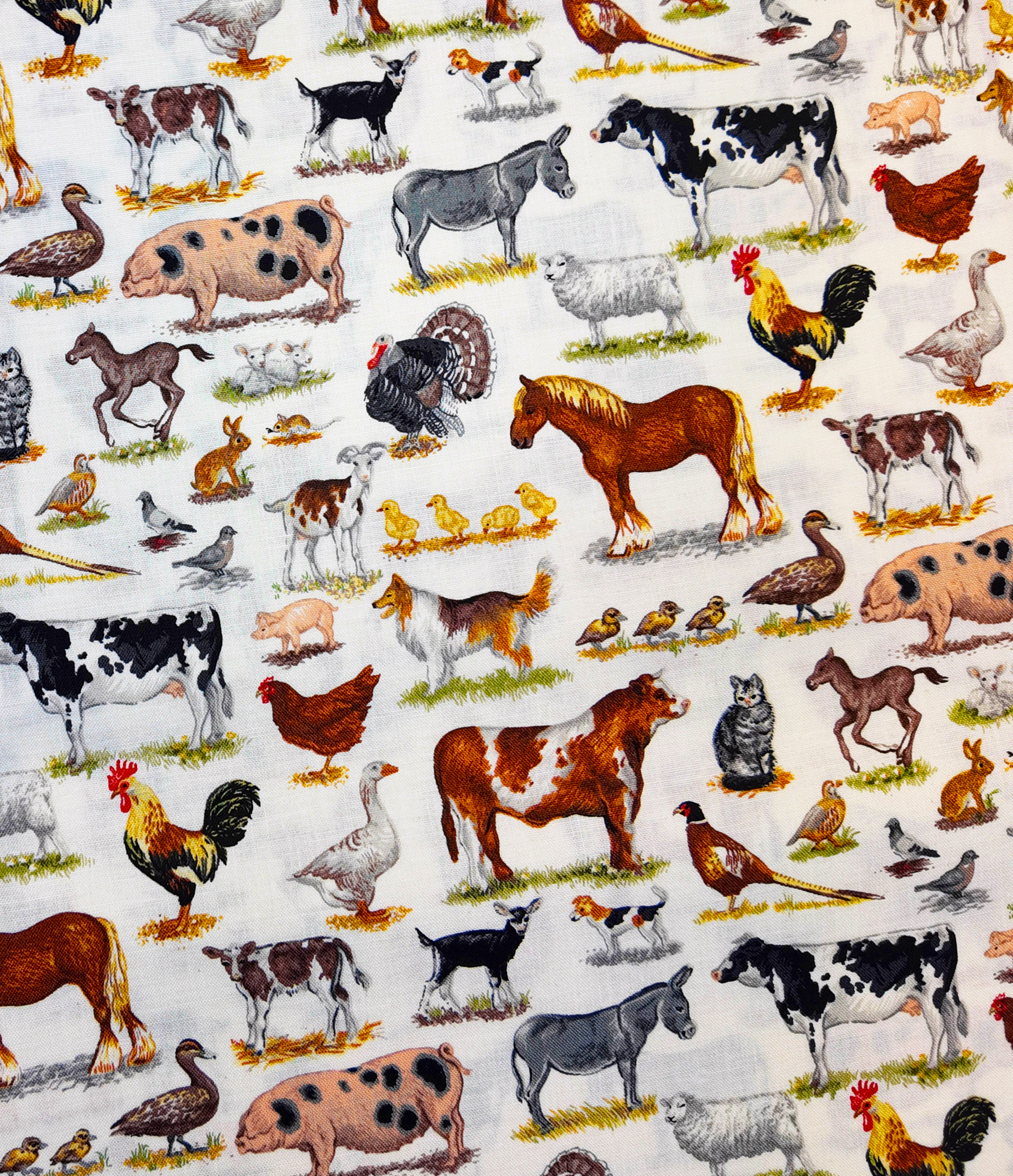 Une joyeuse mosaïque d’animaux de la ferme : chevaux, vaches, poules, cochons et oies se côtoient dans une prairie ensoleillée. Le tissu capture la vitalité et l’abondance du monde rural.