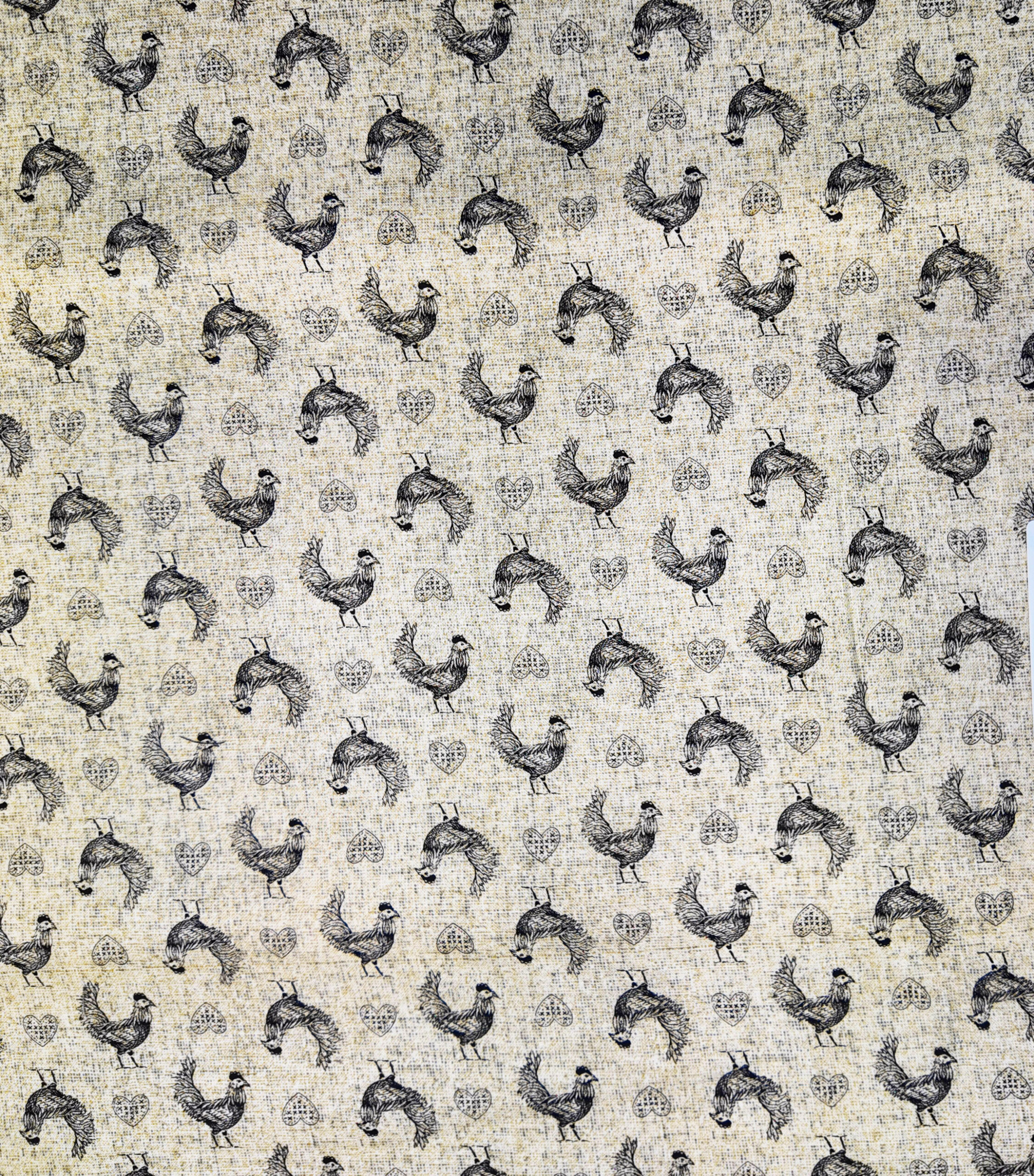 De petits coqs dessinés à l’encre noire se répètent avec élégance sur fond beige. Le tissu respire la simplicité rustique et un charme d’atelier ancien.