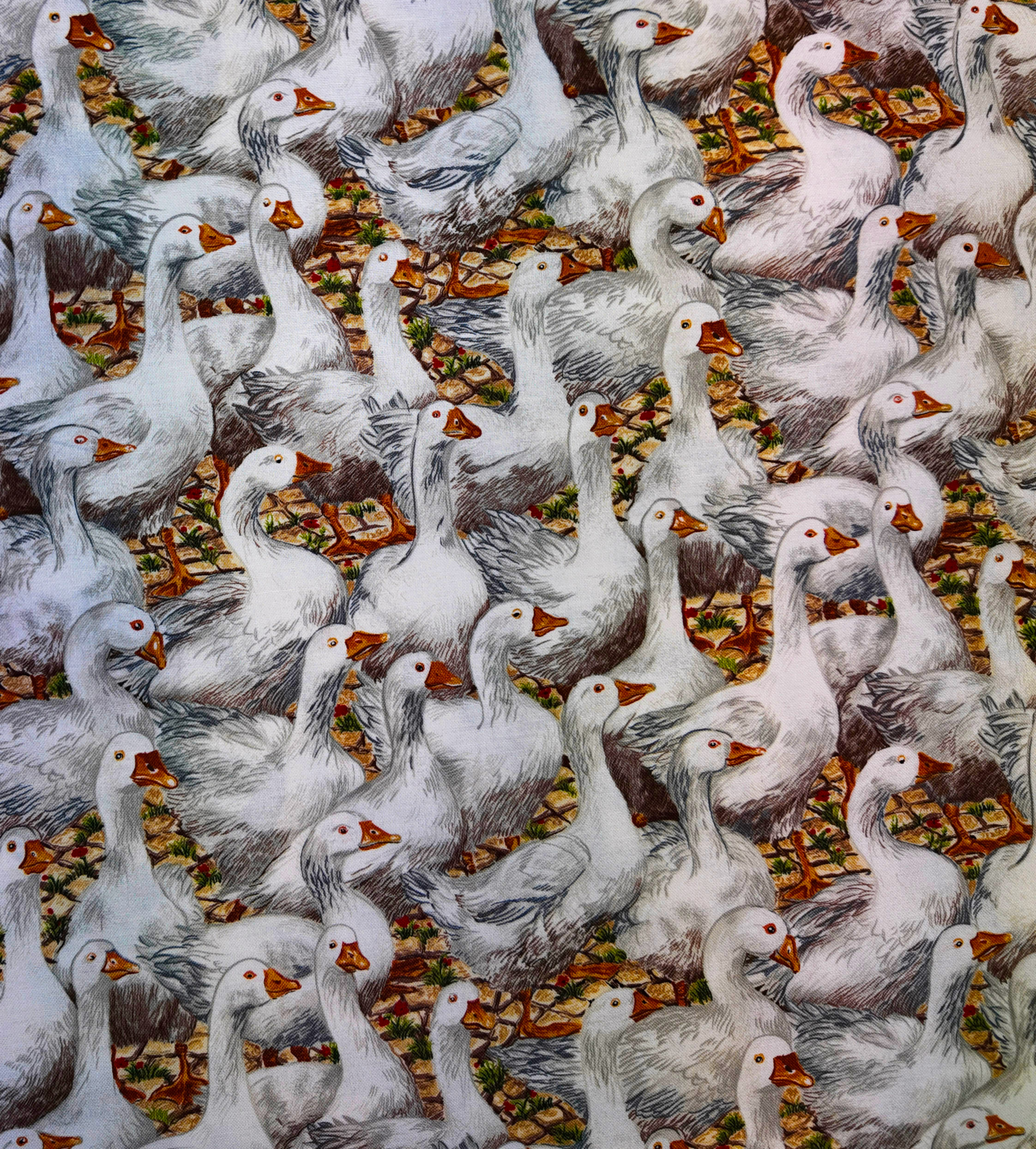 Des oies blanches au plumage délicat se pressent sur un sol automnal. Le tissu respire la vie de la ferme et la sérénité des après-midis paisibles.