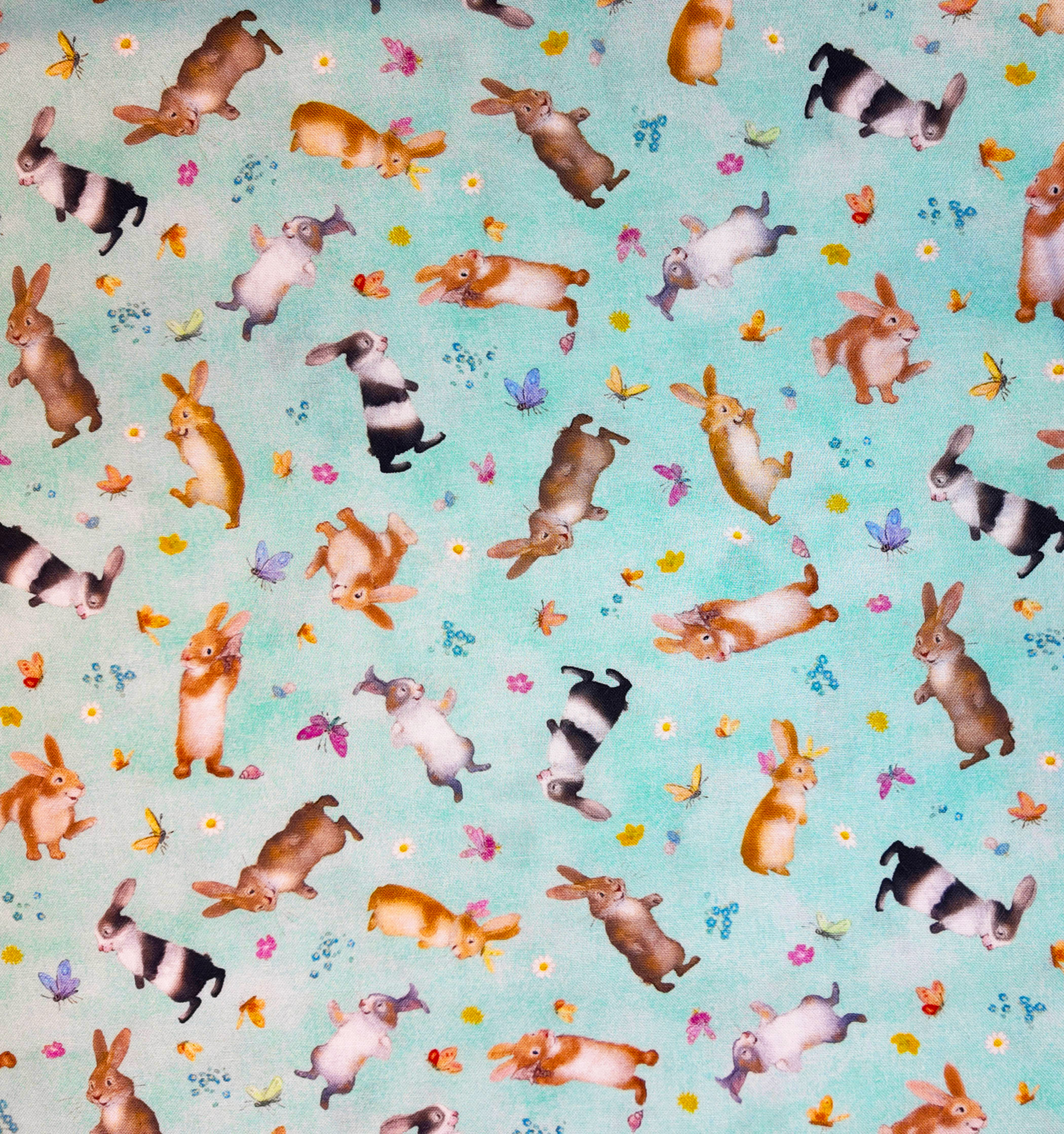 Petits lapins aux couleurs douces gambadant parmi les papillons sur fond turquoise. Le tissu évoque la tendresse du printemps et la légèreté d’un souffle d’air frais.