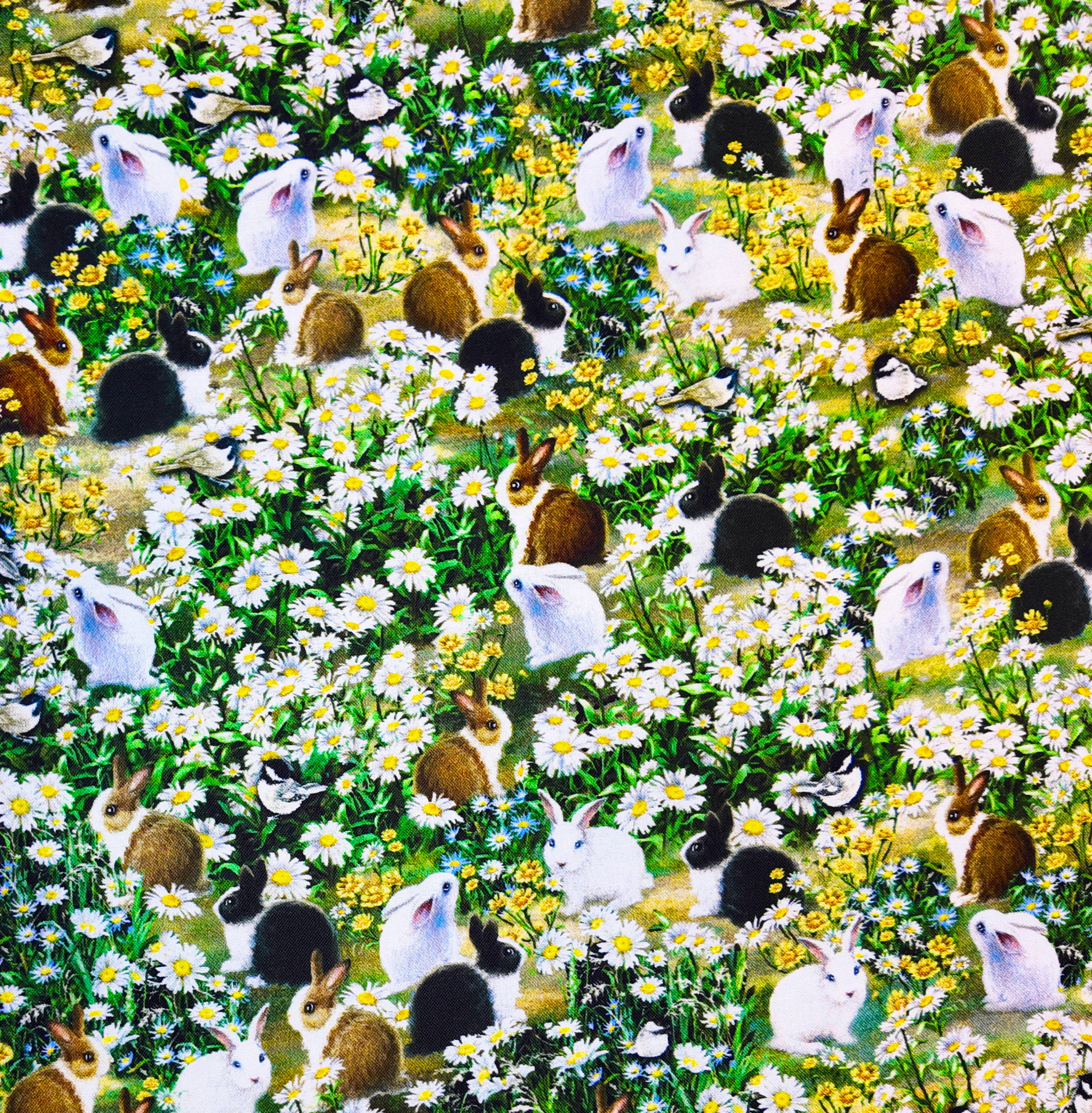 Lapins noirs, bruns et blancs se cachent parmi les marguerites éclatantes. Le tissu rayonne de fraîcheur et d’un charme champêtre.