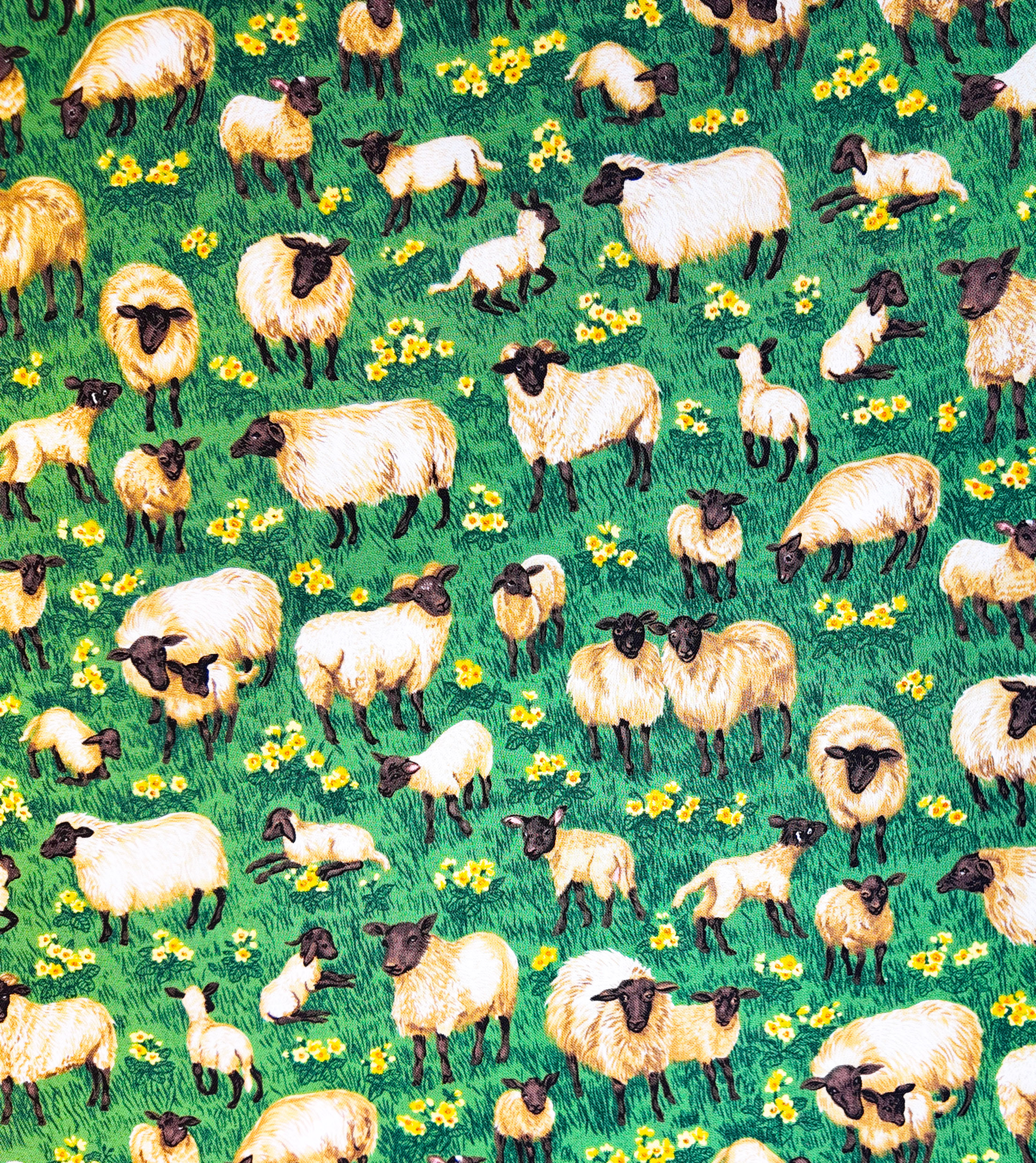 Un troupeau de moutons au pelage doré et aux visages sombres se repose dans un champ de fleurs jaunes. Le tissu évoque la quiétude et la chaleur d’un jour d’été.