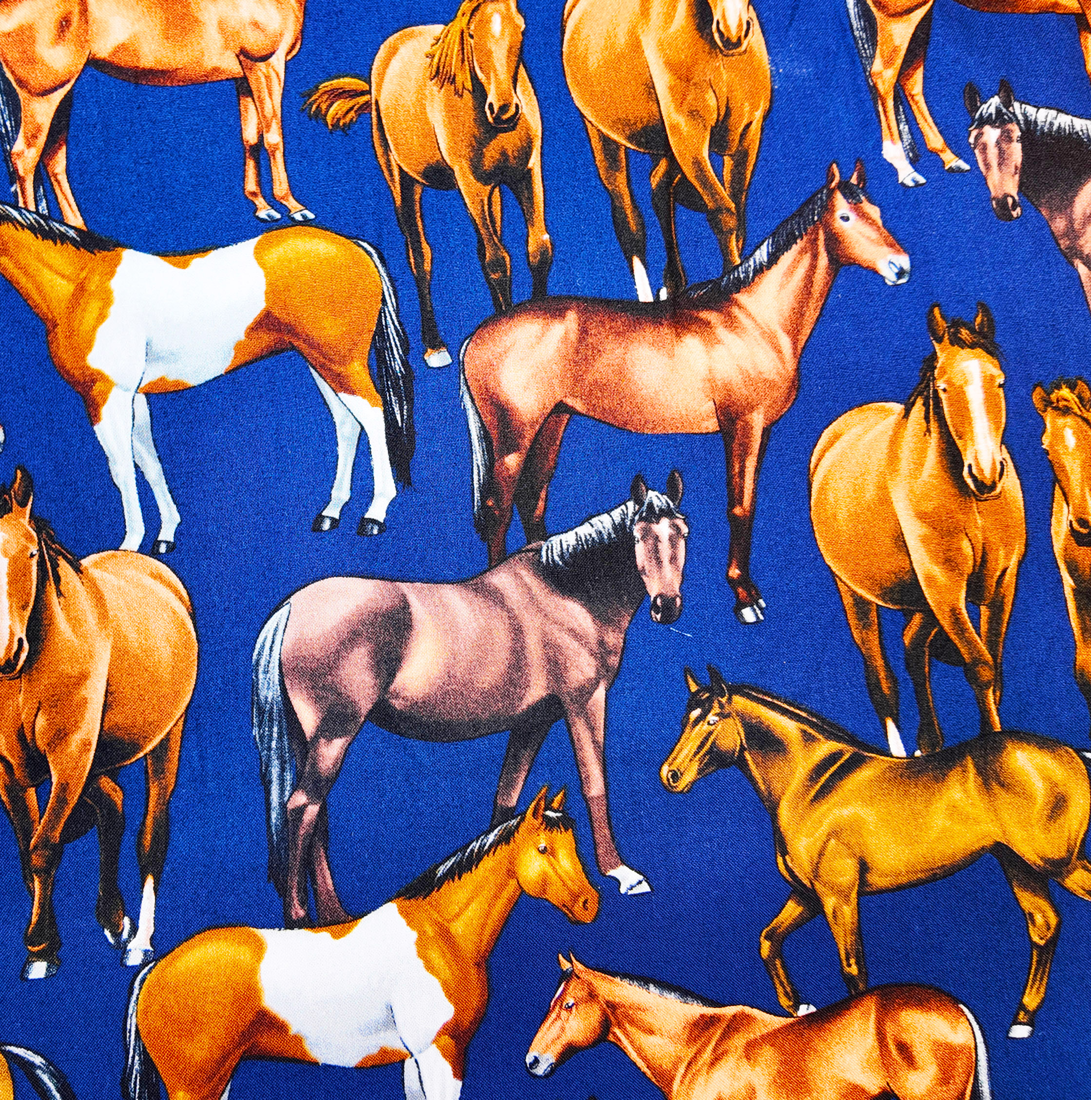 Chevaux bruns, alezans et palominos se détachent sur un fond bleu profond. Le tissu capture la noblesse et la puissance tranquille des chevaux au repos.