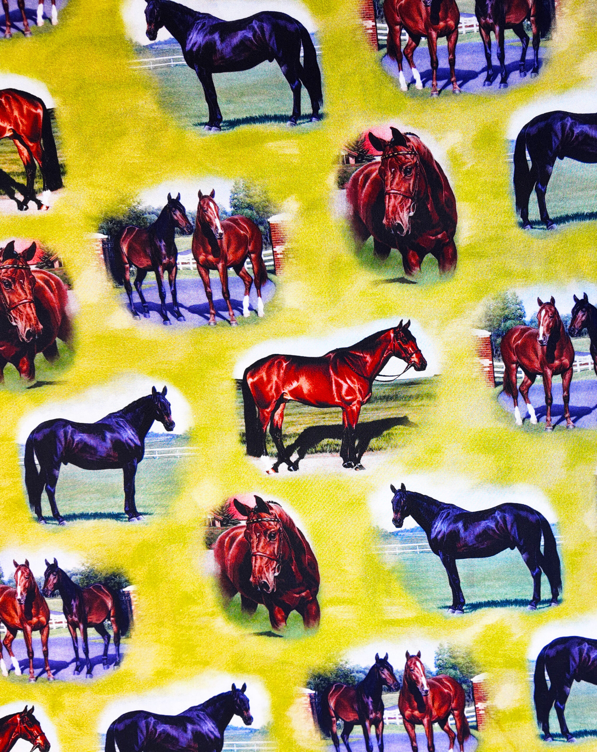 Chevaux noirs et bruns posent dans des prairies ensoleillées, sur un fond jaune lumineux. Le tissu rayonne d’une énergie douce et d’une élégance champêtre.