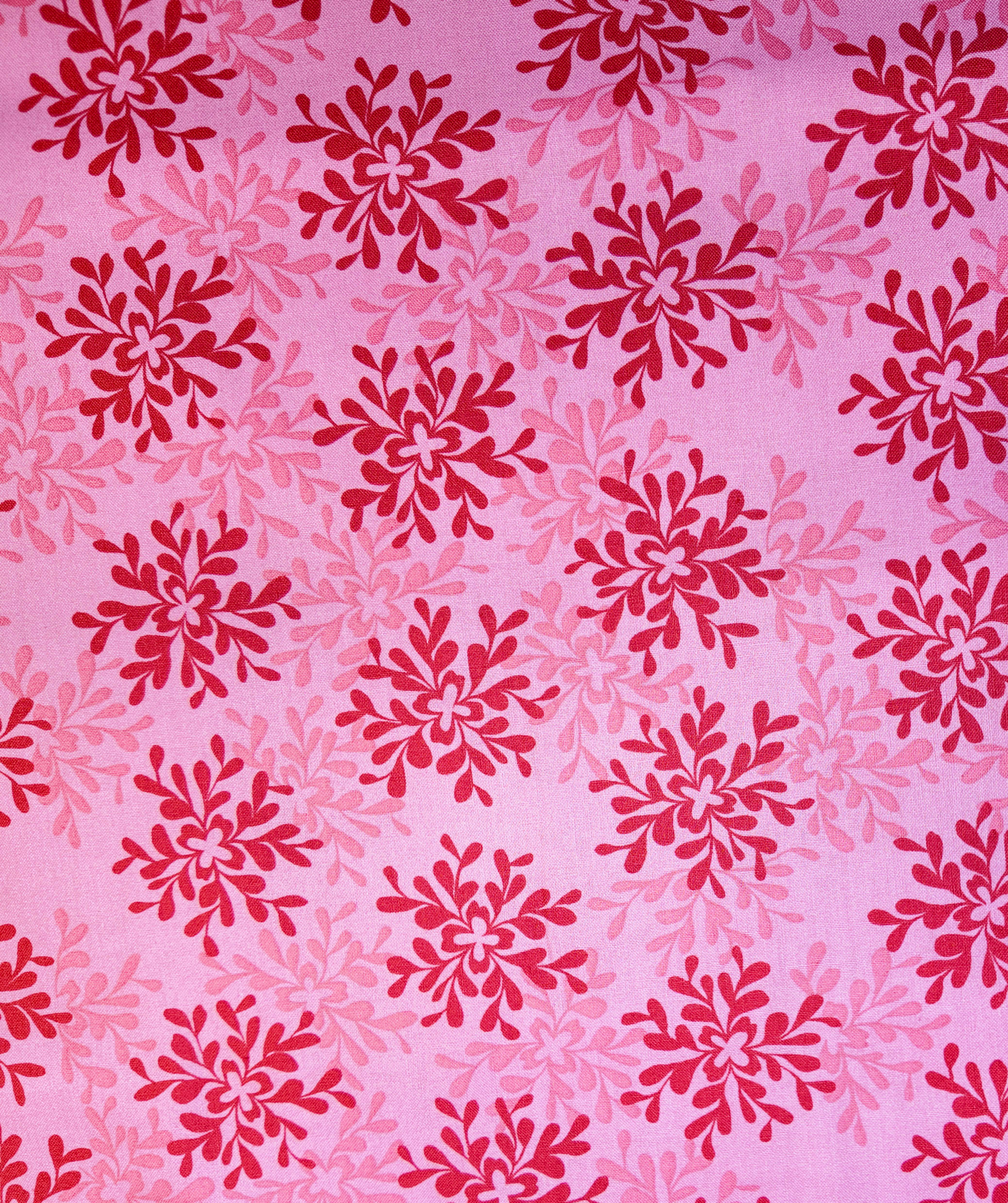 Sur un fond rose doux, des fleurs rouges se déploient en arabesques harmonieuses. Le tissu évoque la tendresse et la chaleur d’un crépuscule d’été.