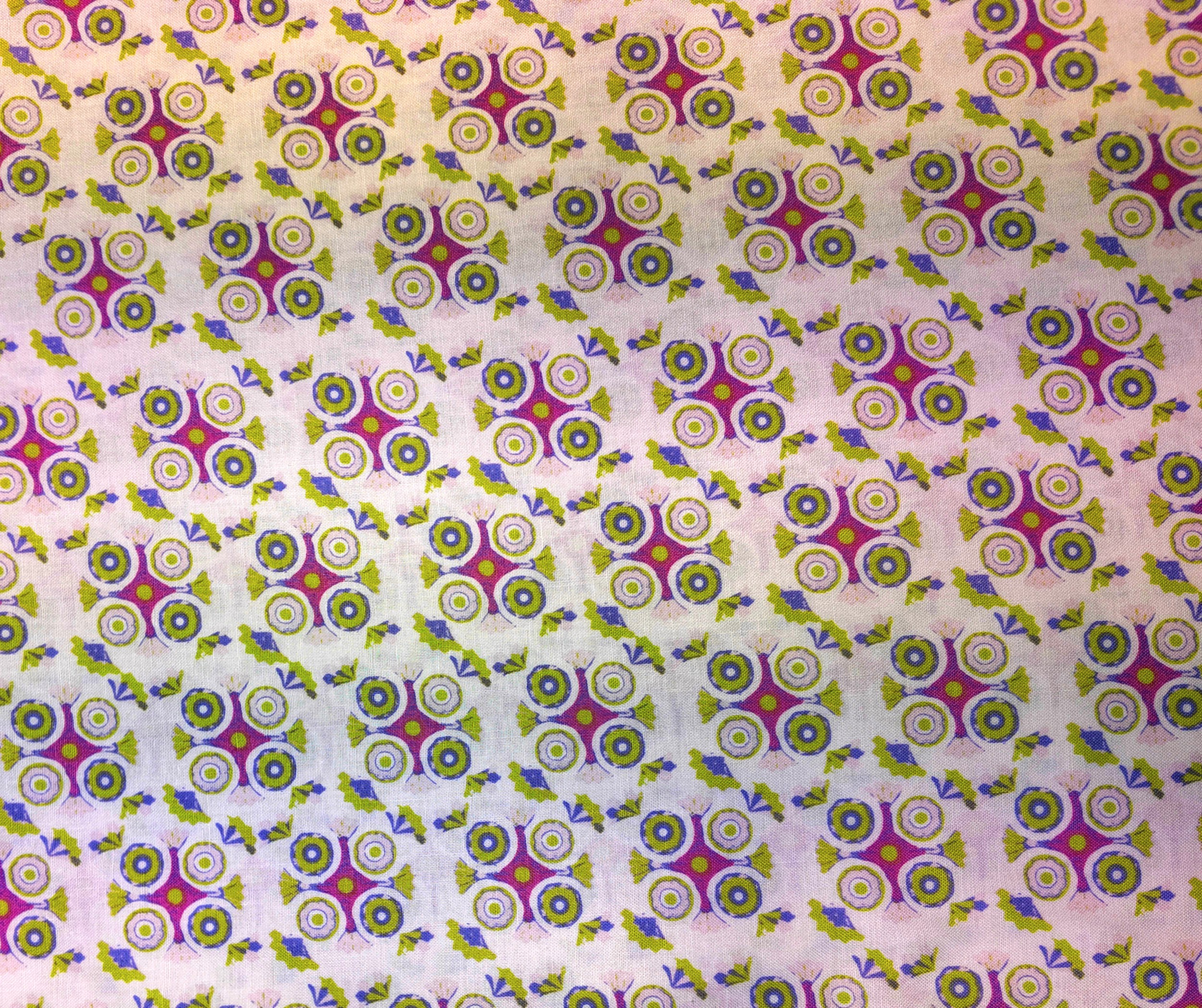 Motifs circulaires roses et verts s’ordonnent en une danse géométrique apaisante. Le tissu allie fraîcheur et délicate fantaisie.