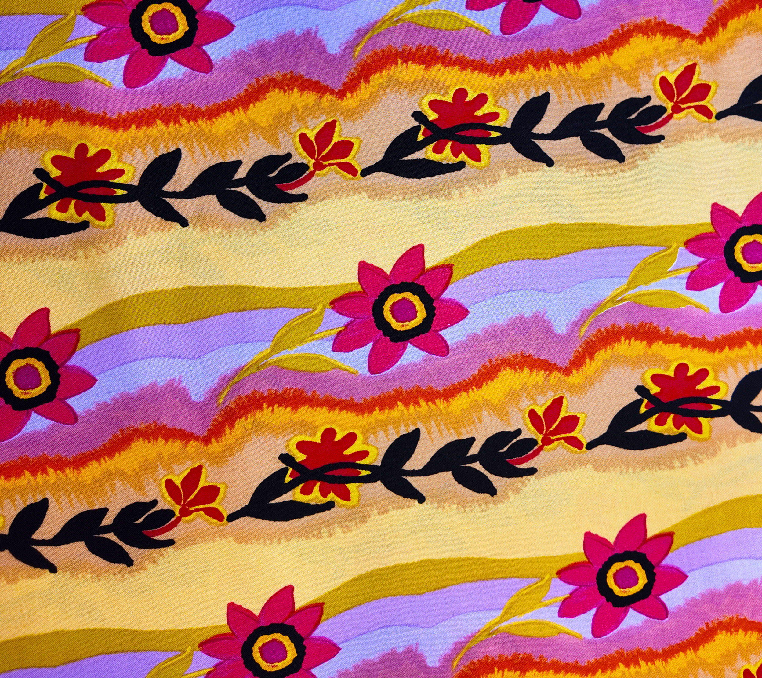 Grandes fleurs rouge carmin se détachent sur des bandes ondulées lilas et dorées. Ce tissu évoque la chaleur d’un couché de soleil exotique.