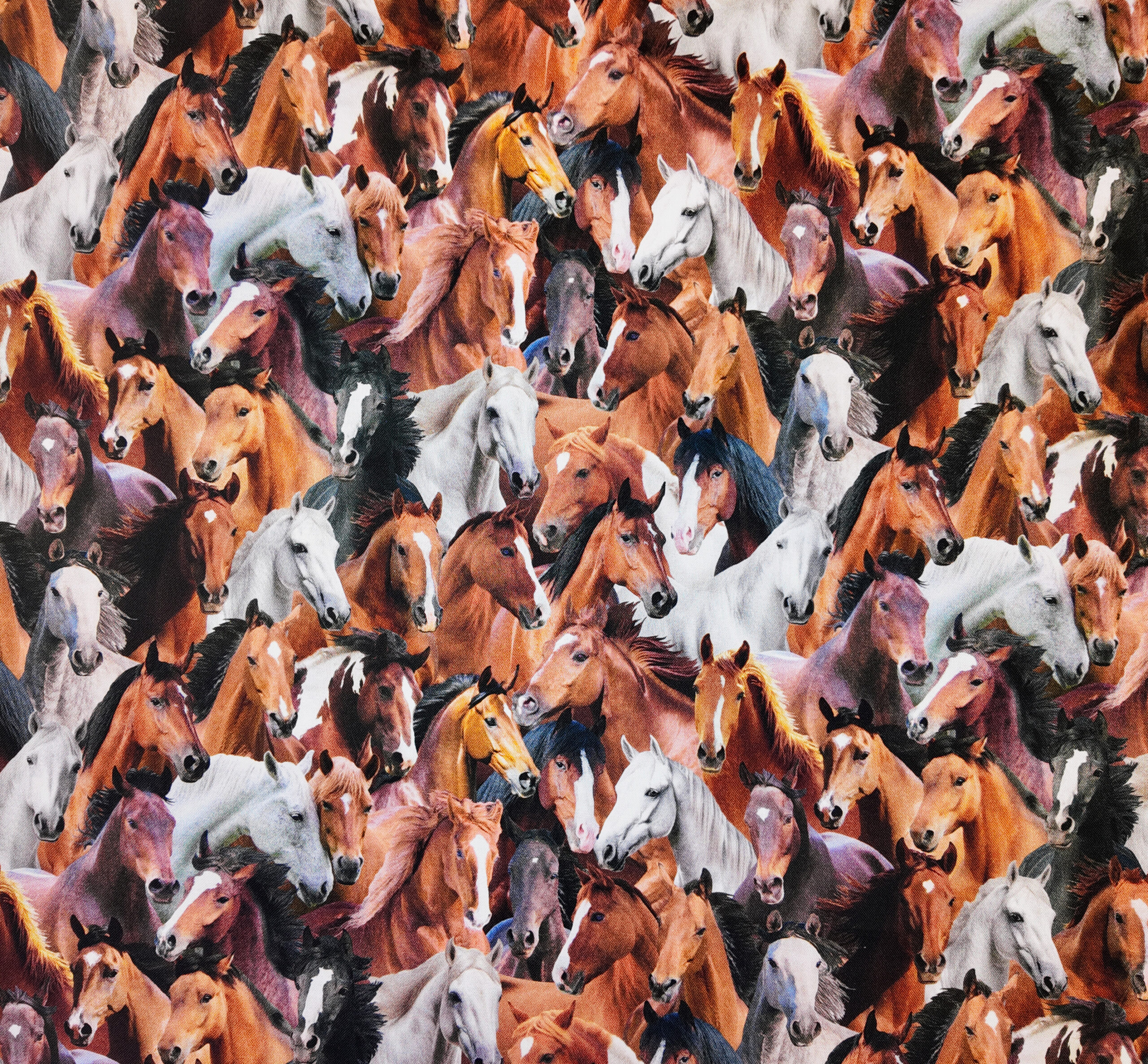 Une multitude de chevaux aux robes variées compose une fresque dense et expressive, où la puissance du mouvement se traduit par une palette chaude et vivante.