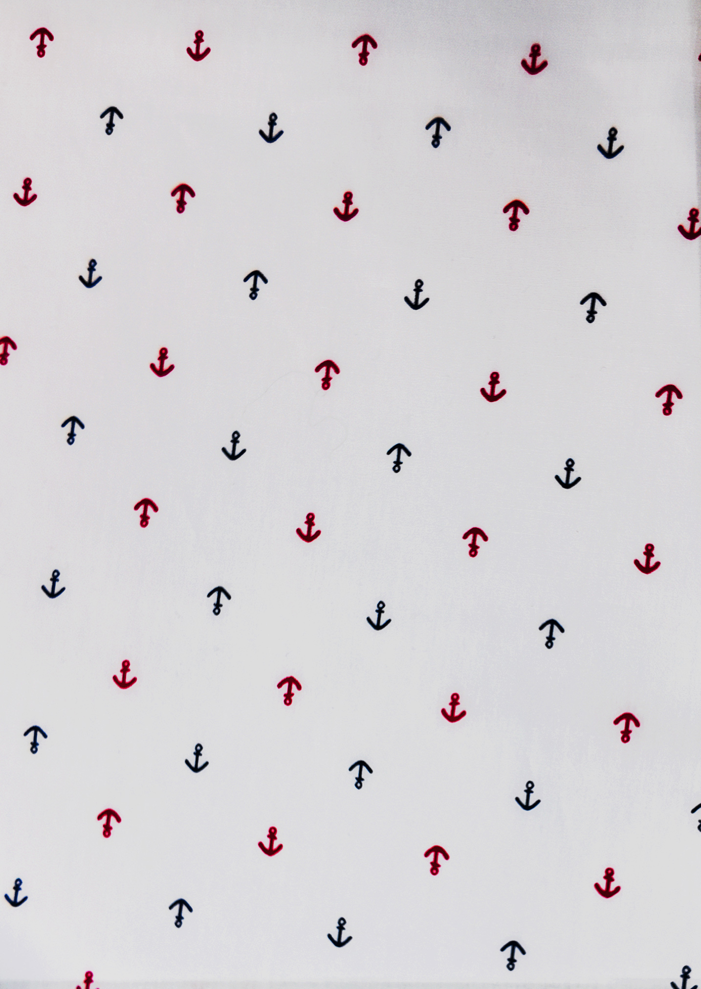 de petites ancres rouge et bleu se dispersent sur le blanc, apportant une touche vive aux accents marins