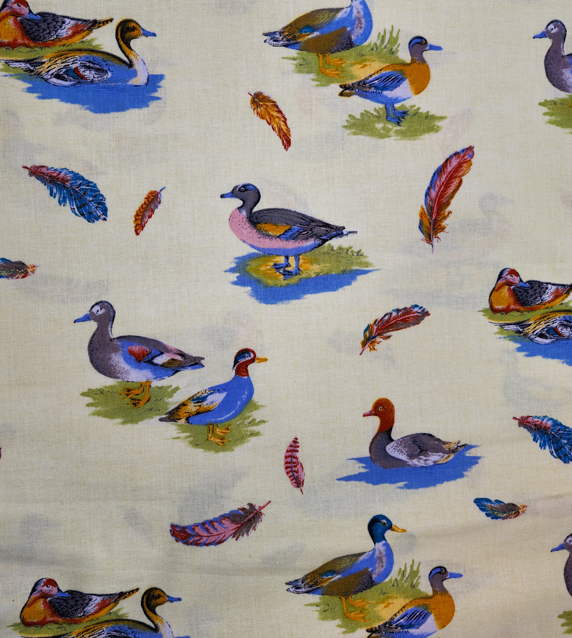 Un décor paisible où canards et plumages colorés se posent sur un fond doux, formant une scène vivante inspirée des berges et de l’eau.