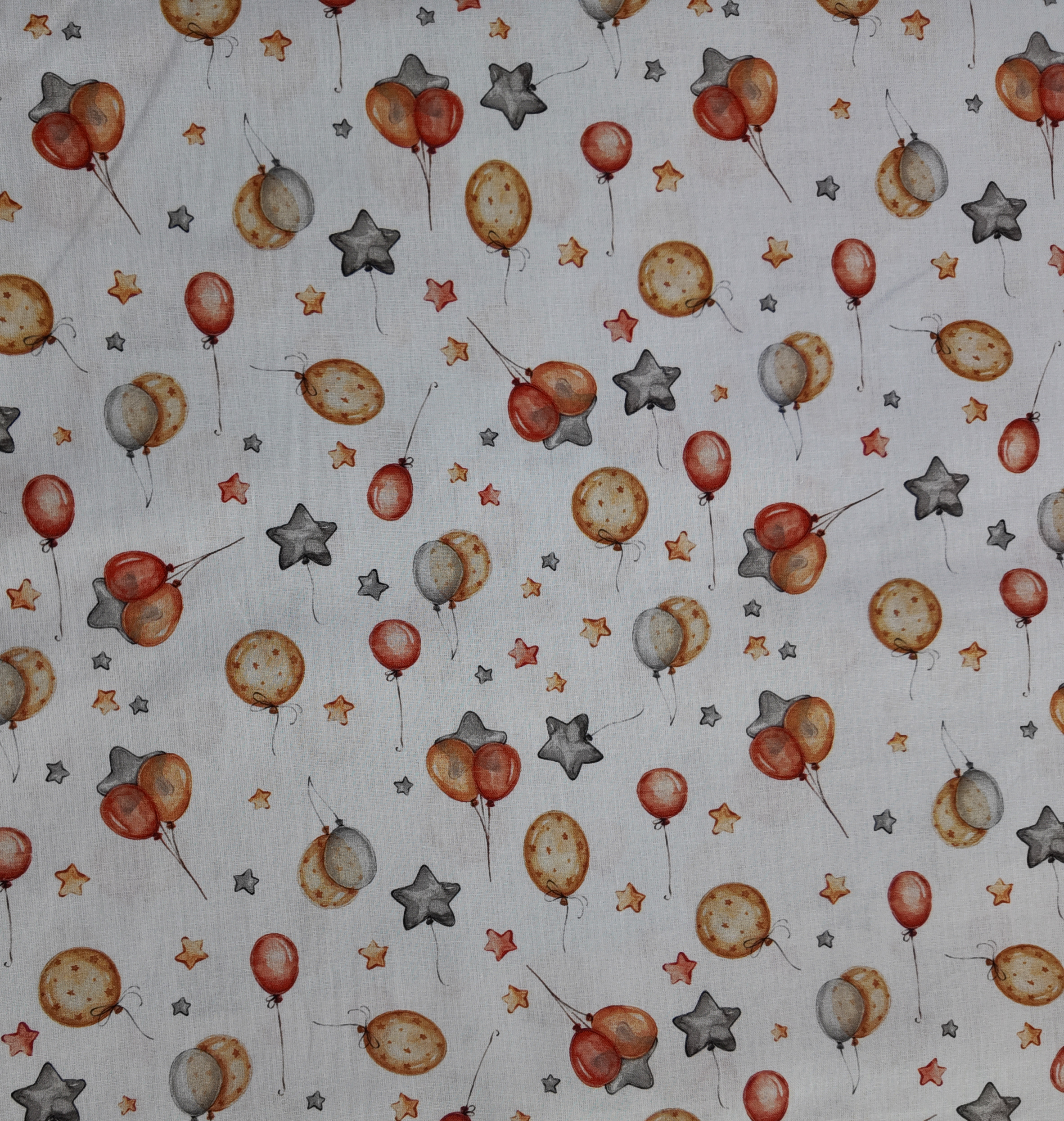 des ballons oranges et gris flottent parmi des étoiles légères sur un fond blanc doux, rappelant la joie simple des fêtes enfantines.