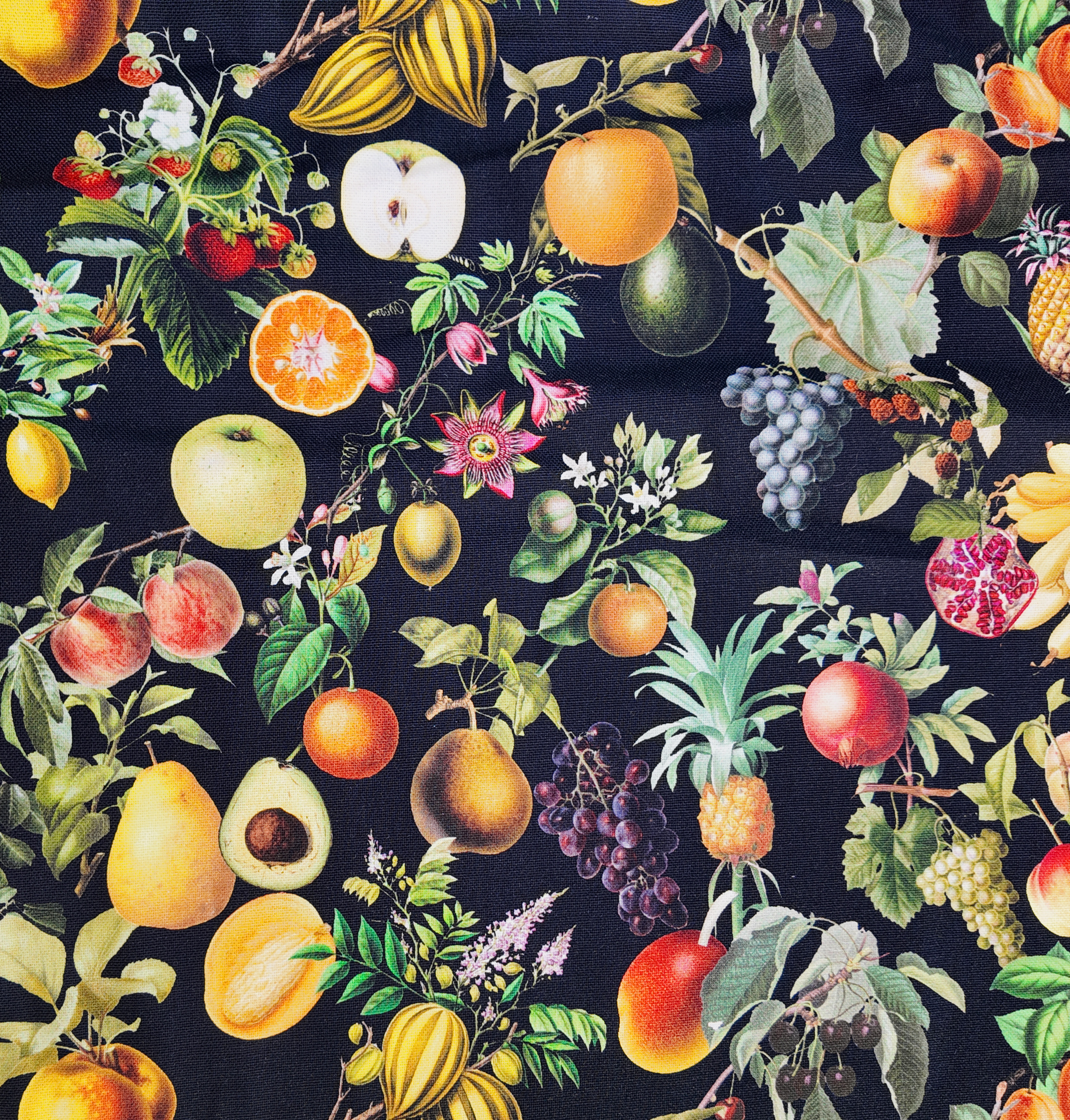 Un festival de fruits colorés éclatant sur un fond sombre : agrumes, baies, pêches, raisins et feuilles se mêlent en une composition luxuriante et éclatante.