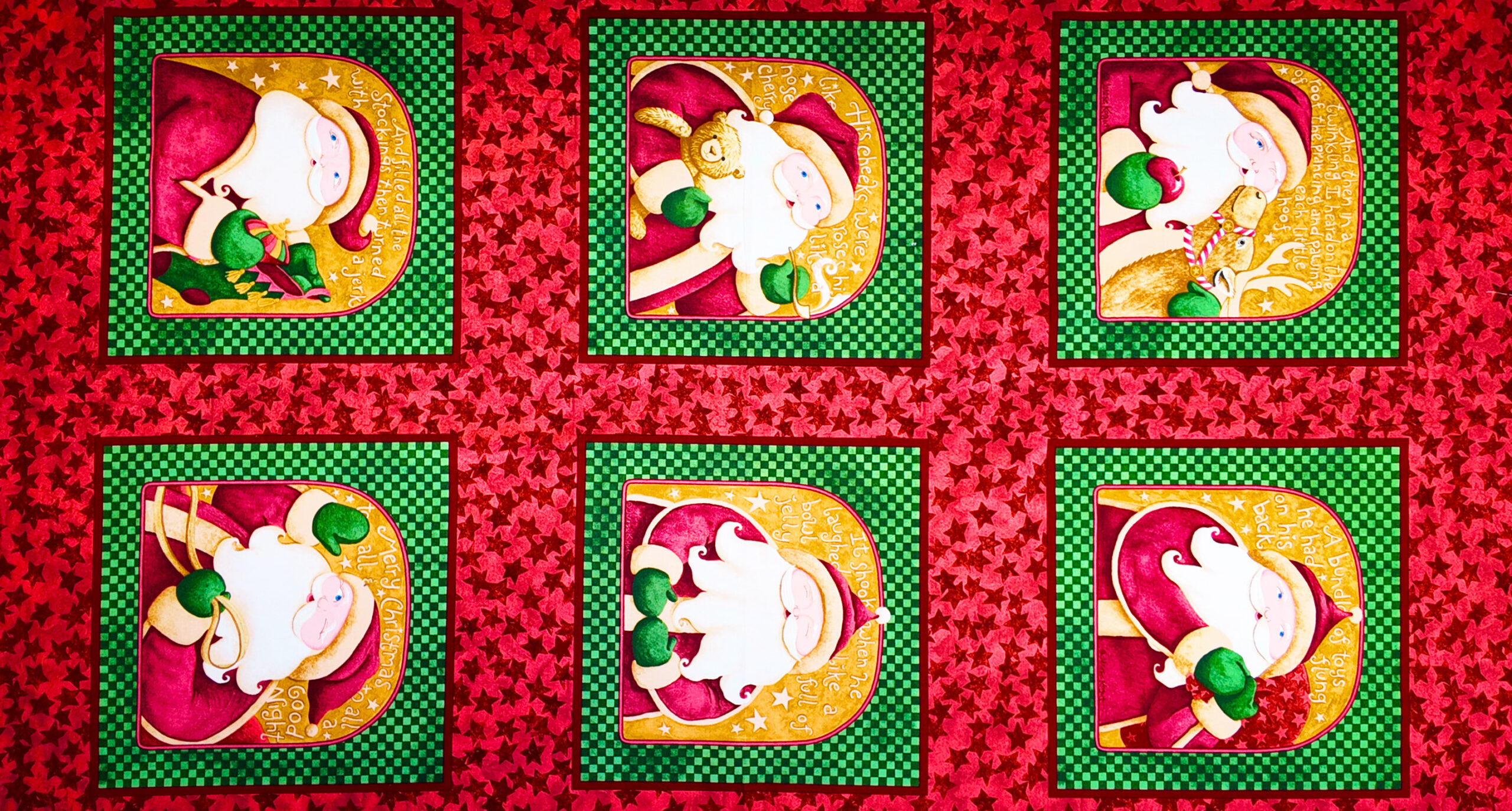 Tissu de Noël éclatant où six carrés illustrent un Père Noël jovial sur fond doré et vert damier. L’ensemble est encadré d’un rouge profond semé d’étoiles, rappelant la chaleur d’un soir de fête et l’esprit magique des cadeaux partagés.
