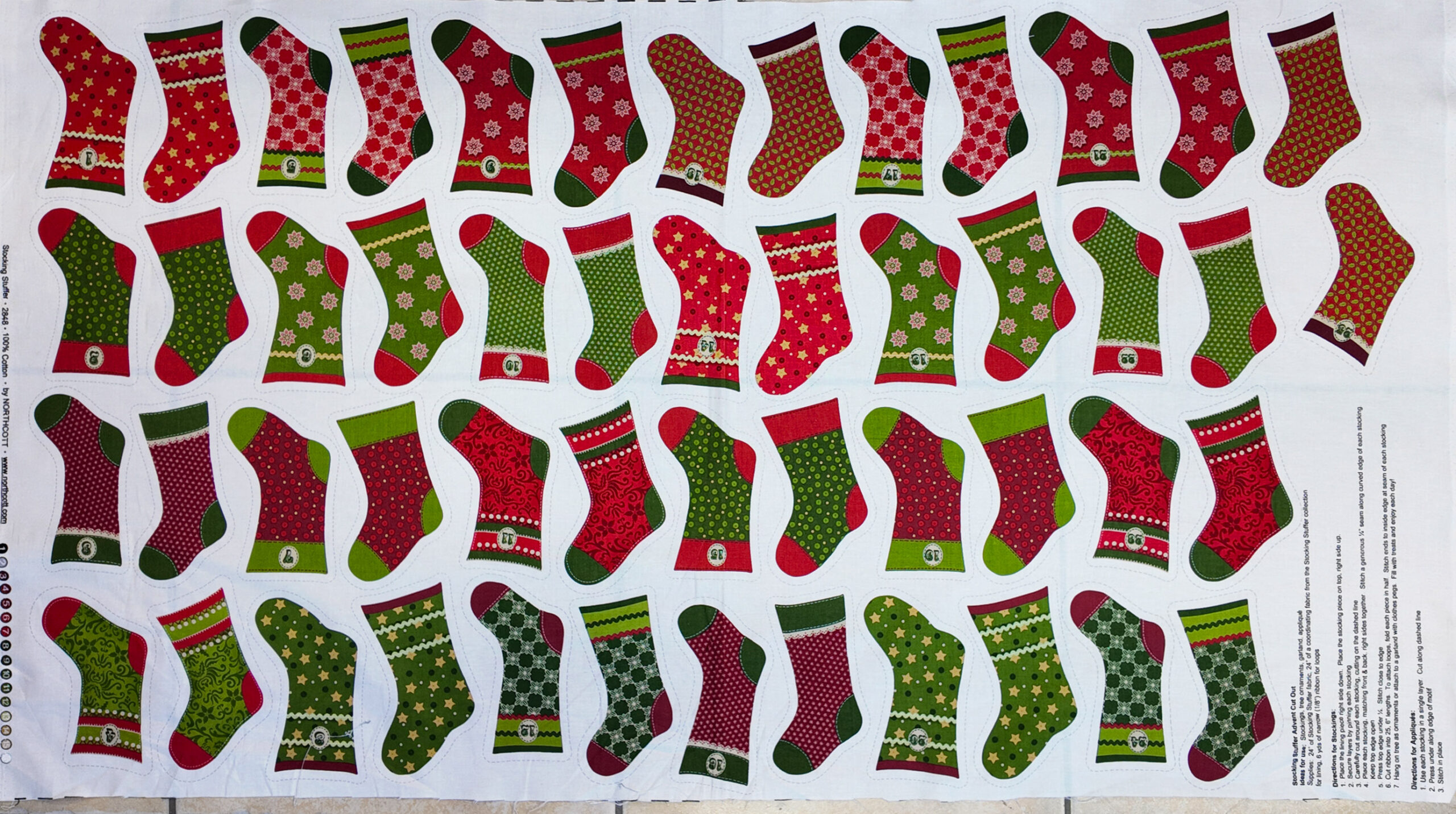 Joyeuse farandole de chaussettes de Noël, aux teintes rouge, vert et or, dans un jeu de motifs variés évoquant la chaleur du foyer. Chaque chaussette semble attendre un petit trésor, rappelant les veillées emplies d’attente et de rires d’enfants.