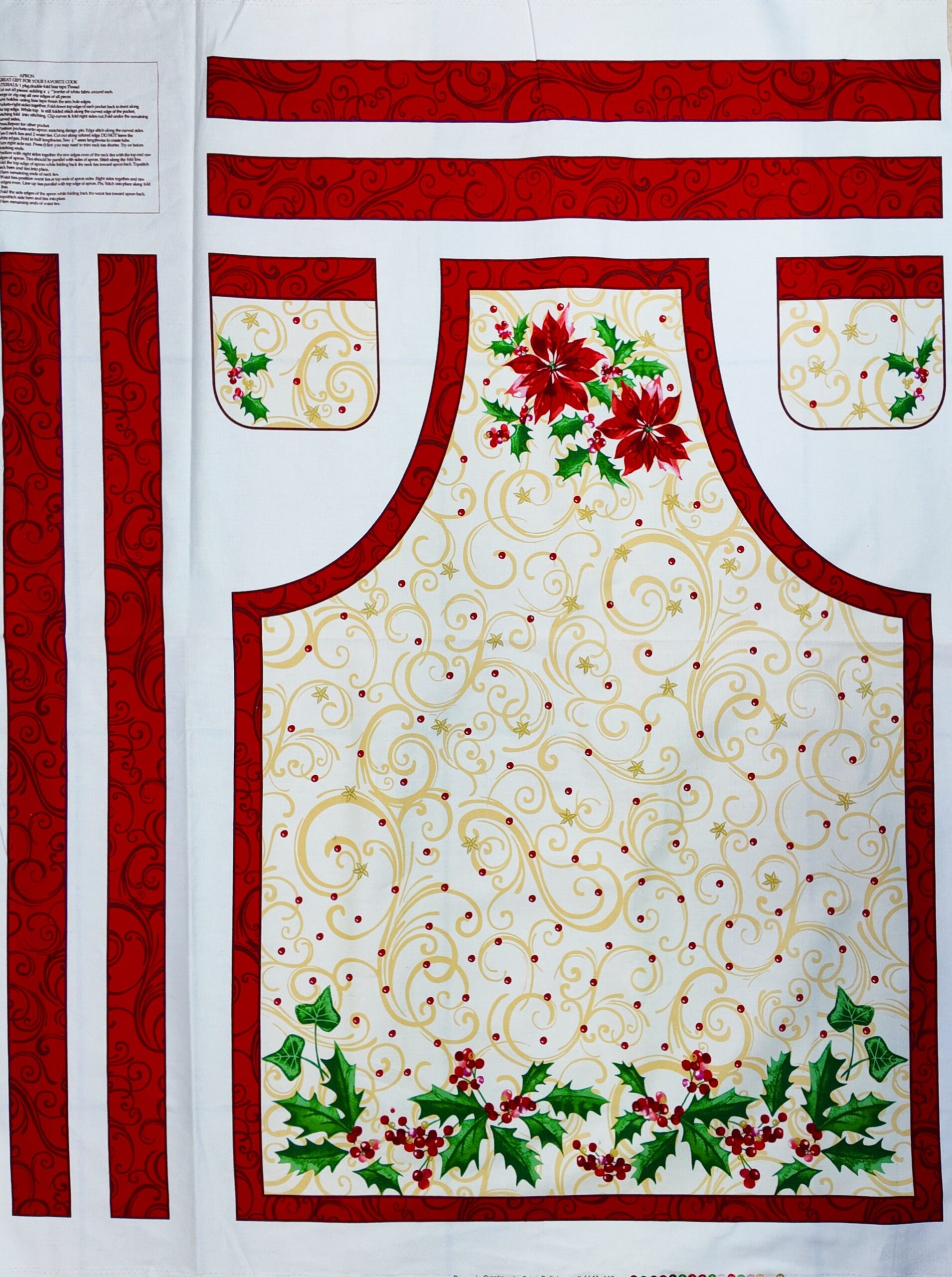 Élégant tissu de fête représentant un tablier orné de poinsettias et de houx sur fond ivoire rehaussé d’arabesques dorées. Les bordures rouges et les détails raffinés évoquent la chaleur d’une cuisine de Noël empreinte de douceur.