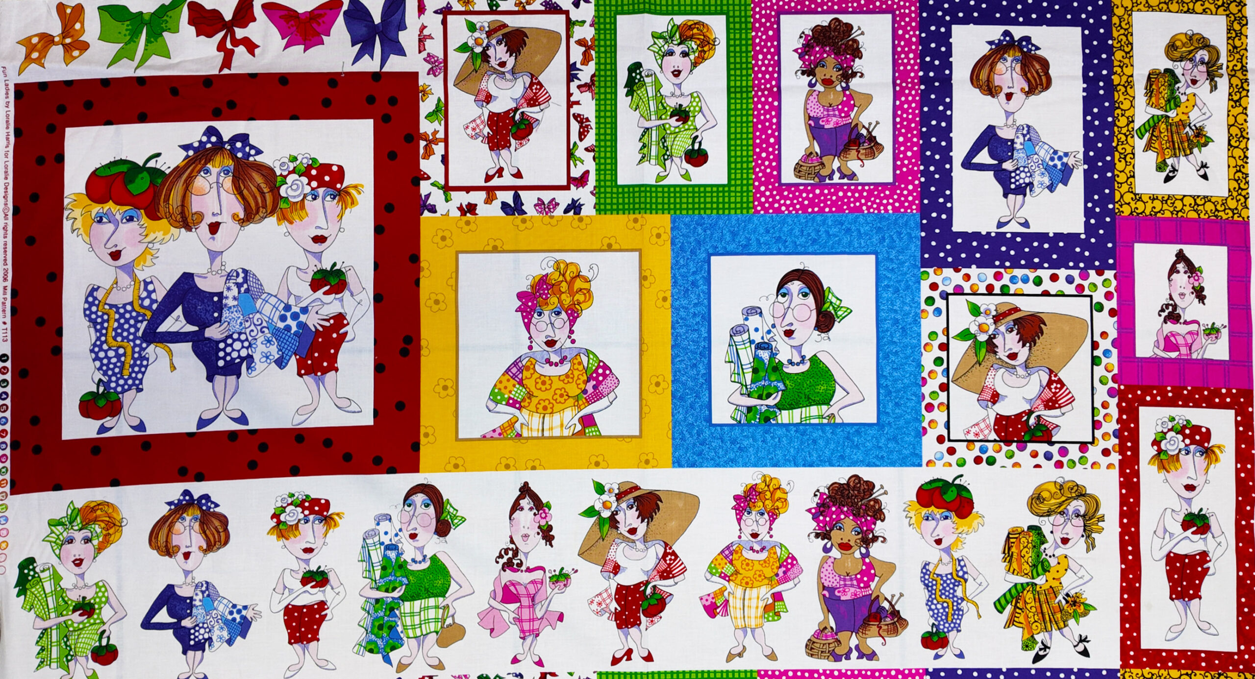 Tissu éclatant de vitalité où des femmes aux tenues colorées posent parmi des cadres vifs et joyeux. Entre pois, carreaux et fleurs, l’ensemble respire la bonne humeur, la créativité et l’esprit pétillant d’un atelier couture.
