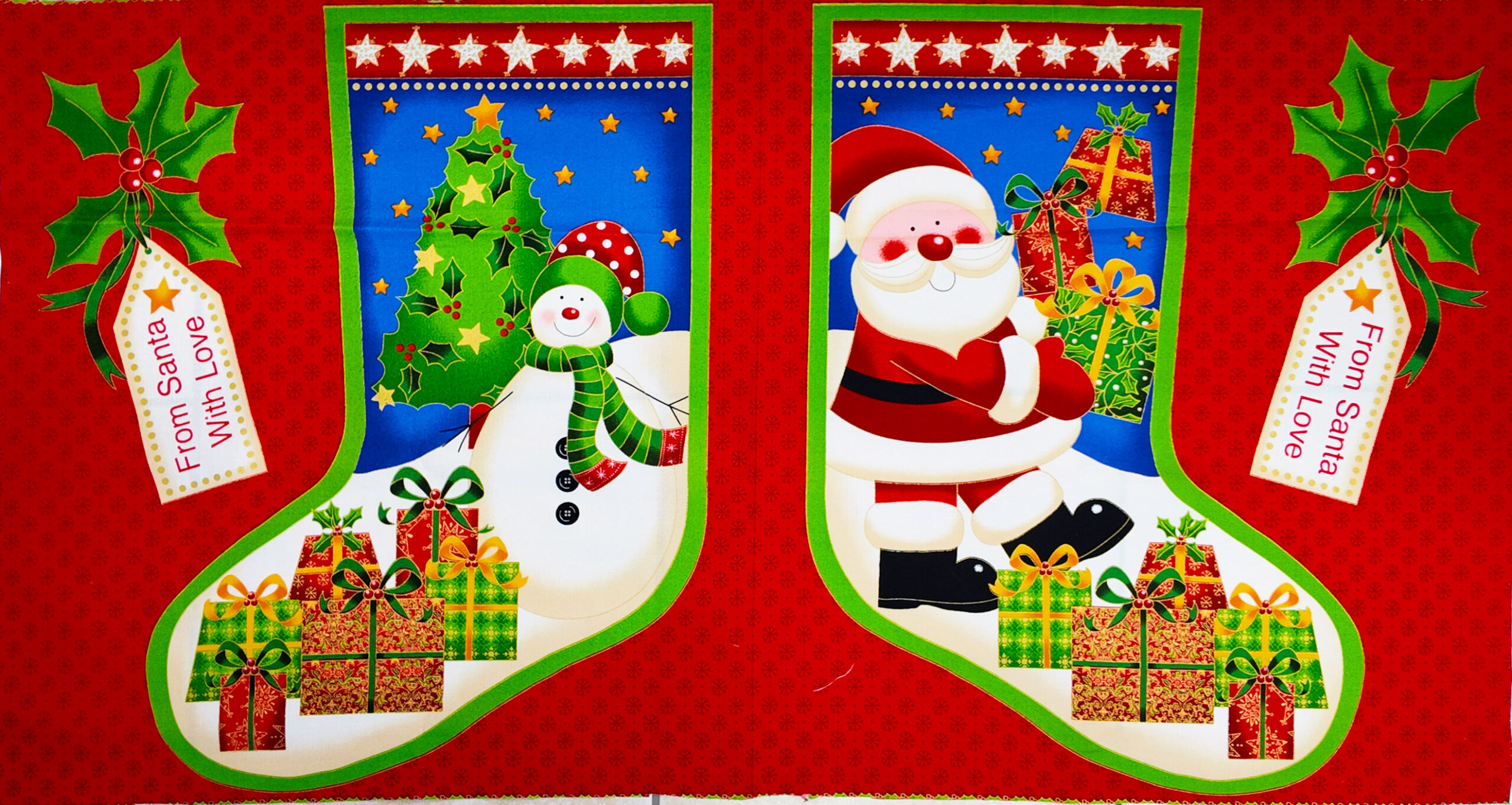 Deux grandes chaussettes de Noël colorées décorées d’un Père Noël, d’un bonhomme de neige et de nombreux cadeaux scintillants. Le fond rouge et bleu vibrant respire la joie et la générosité des fêtes hivernales.