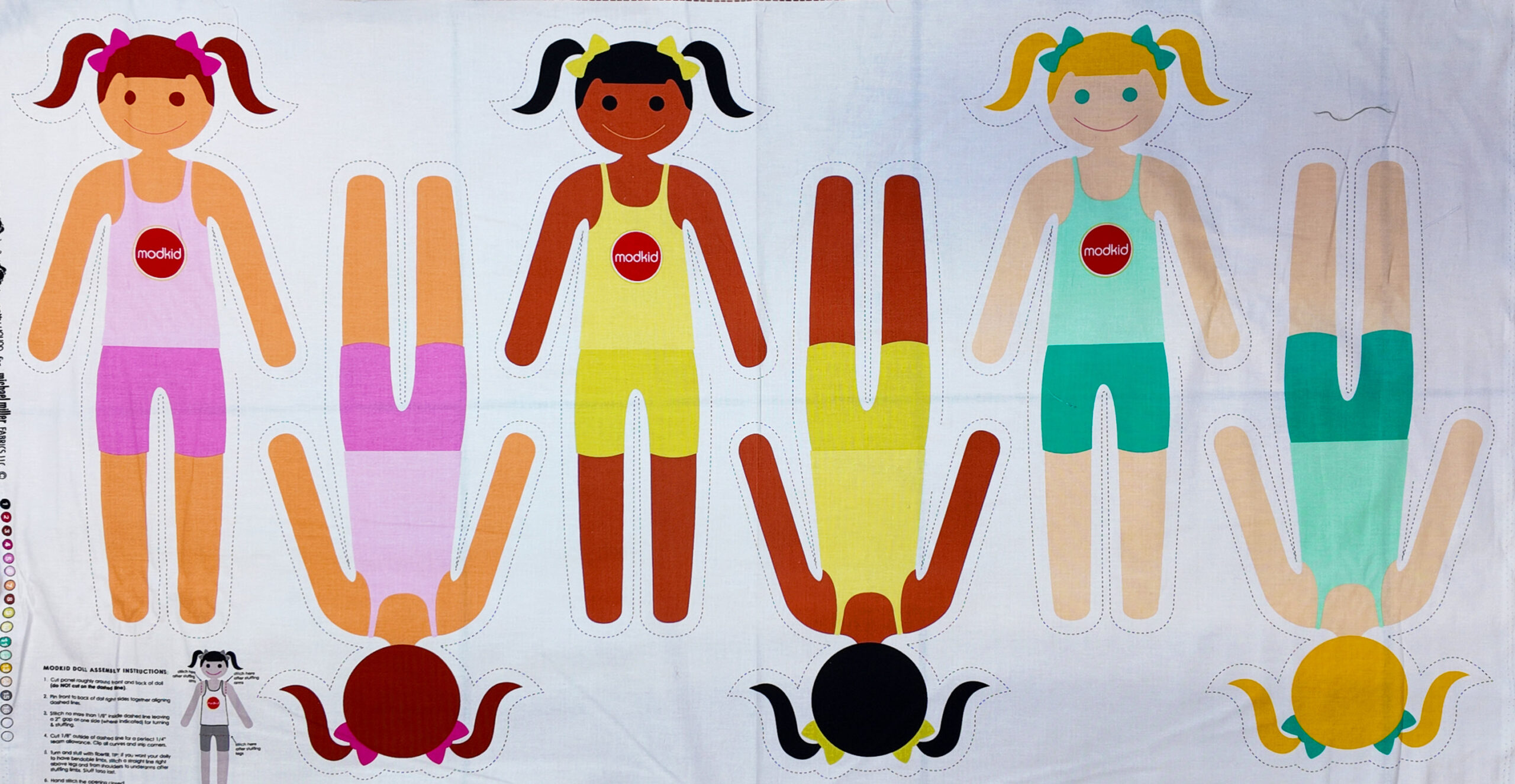 Tissu ludique représentant des poupées à assembler, chacune vêtue de couleurs vives et coiffée de rubans assortis. Les teintes joyeuses de rose, jaune et turquoise invitent à la créativité et au jeu enfantin.
